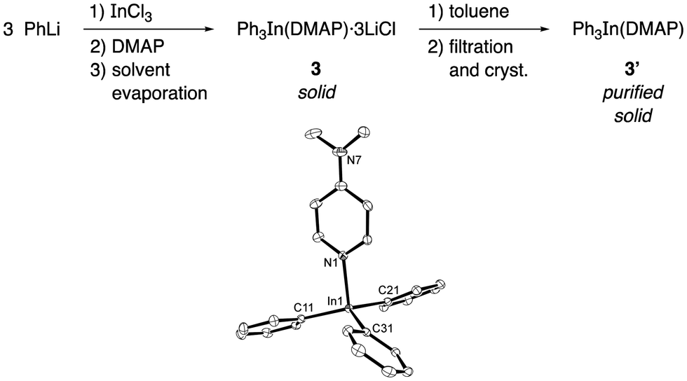Accordingly, the addition of DMAP (1 equiv.) to a THF solution of Ph3In at room temperature for one hour followed by evaporation of the solvent in vacuo gave a white solid with the tentative formula Ph3In(DMAP)·3LiCl (3, Scheme 1). This compound was found to be bench-stable, and was handled in air and used as a solid reagent. In order to characterize this solid, the LiCl was removed by filtration after boiling in dry toluene. This process afforded a compound that was crystallized from toluene/hexane (3 : 1). X-ray diffraction studies on the pure crystals (3′) showed a trigonal pyramidal structure in which the ideal plane formed by the phenyl groups and the indium atom is distorted by the ligand (DMAP) to give an N–In–C dihedral angle of around 100° (Scheme 1). The In–N distance was 2.27 Å and the In–C distance was 2.17 Å. Interestingly, the cross-coupling reaction with 4-bromoacetophenone carried out using the purified crystals (3′) afforded the coupling product in an excellent yield (90%) on using only 34 mol% of the solid organometallic reagent and showing the efficient transference of all three organic groups attached to the indium to the electrophile.