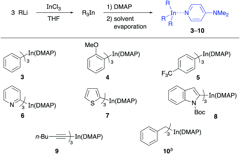 In the field of indium chemistry, Schumann and co-workers reported an extensive study on the characterization of indium organometallics stabilized by intramolecular coordination using nitrogen or phosphorus atoms.11 The isolation and characterization of allyl and 1-butenylindium halides stabilized by complexation with phosphine and pyridine ligands were also reported by Baba.6,12 Trimethylindium complexes have also been characterized but their reactivity and synthetic utility remains unknown.11,13 Herein, we report the preparation of stable solid triorganoindium compounds stabilized by coordination with 4-(dimethylamino)pyridine (DMAP) and their reactivity in palladium-catalyzed cross-coupling reactions.