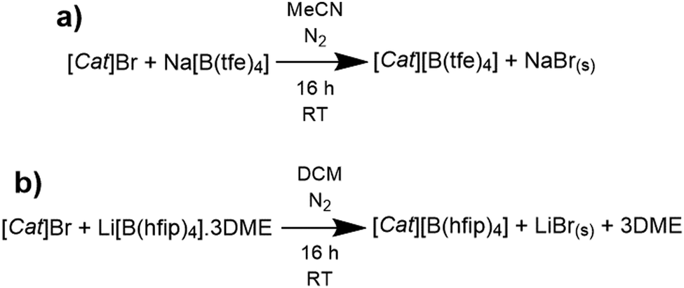All reagents were used as received. Na[B(OCH2CF3)4] (Na[B(tfe)4]), Li[B(OCH(CF3)2)4]·xDME (Li[B(hfip)4]·3DME) and N2(2O2O1)3Br were synthesised according to published methods.29,32,34