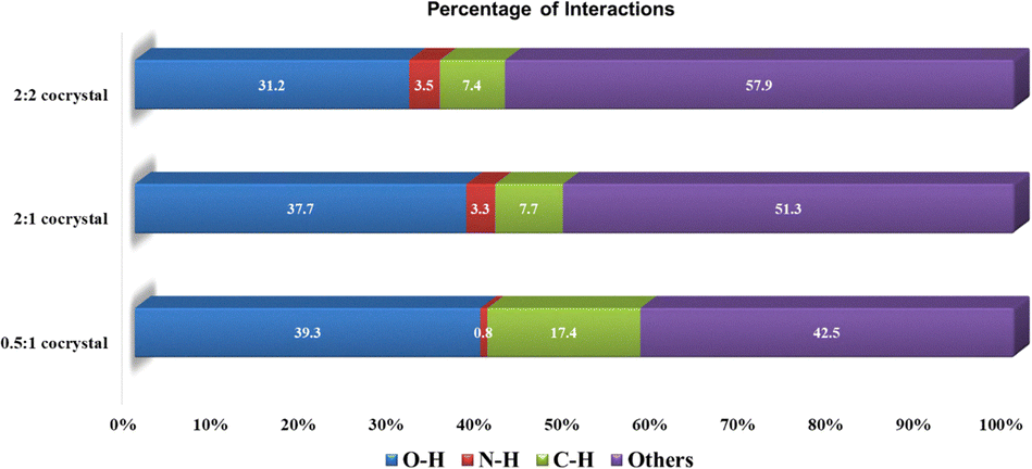 To investigate the relative stability of the ratiometric cocrystals, we performed Hirshfeld surface analysis on all the urea·24DHBA cocrystals and generated their corresponding 2D fingerprint plots (Fig. S4). By quantifying the contributions of various intermolecular interactions (Fig. 2), we observed that the O⋯H hydrogen bonding interactions (blue bar) exhibited the highest contribution of strong non-covalent interactions to the Hirshfeld surface for all cocrystals analyzed. Specifically, the (urea)0.5·(24DHBA) cocrystal showed the greatest contribution from O⋯H interactions at 39.3%, followed by (urea)2·(24DHBA) at 37.7%, and the lowest in the (urea)2·(24DHBA)2 cocrystal at 31.2%. These results highlight a trend in which the strength and prevalence of O⋯H interactions correlate with the relative thermodynamic stability of the cocrystals, i.e thermodynamic stability of the reported (urea)0.5·(24DHBA) cocrystal and metastable nature of the (urea)2·(24DHBA)2 cocrystal. Differential scanning calorimetry (DSC) analysis revealed a consistent trend, with the highest melting peak observed for the (urea)0.5·(24DHBA) cocrystal, which also contained trace amounts of the other two stoichiometric cocrystals as impurities. In contrast, the lowest melting point corresponded to the metastable (urea)2·(24DHBA)2 cocrystal (Fig. S5).