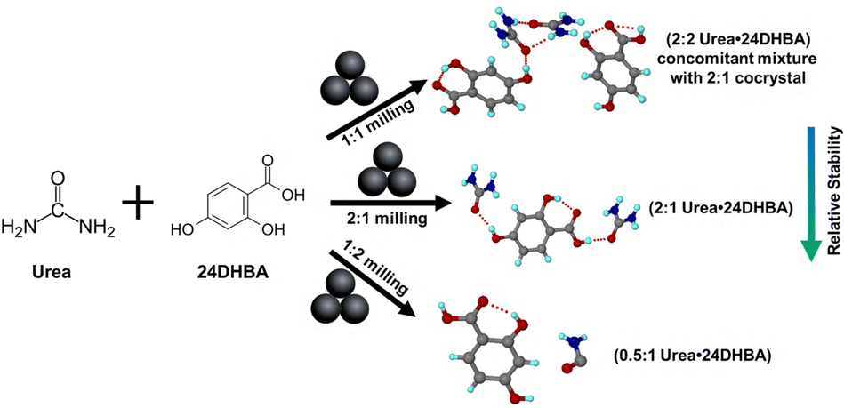 1 stoichiometric mixtures. Interestingly, the metastable (urea)2·(24DHBA)2 cocrystal was only observed during mechanochemical milling, consistently appearing as a minor, concomitant phase alongside the 1