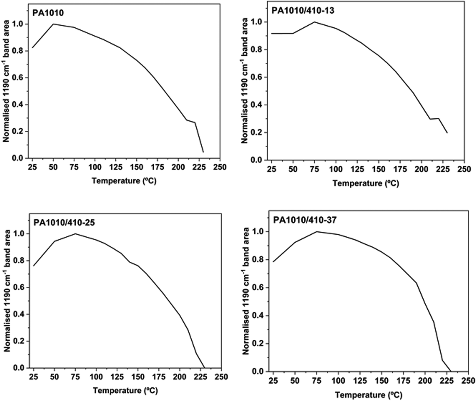 | Fig. 10 Normalized area corresponding to 1190 cm−1 band of polyamide 1010 (PA1010) and copolyamides 410/1010: PA1010/410 with 12.5, 25 and 37.5 mol% nylon 410. | ||