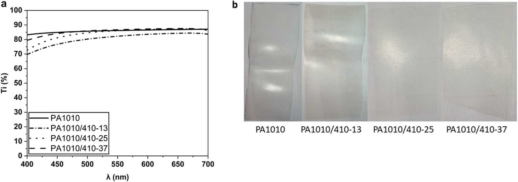 as well as the total color difference, expressed as ΔE*, concerning the homopolyamide PA1010 film. Fig. 11a represents the spectral distribution curve of the percentage of Ti of the PA1010 and PA1010/410 films as a function of wavelength (λ). All the bio-based polyamide films showed relatively high values of Ti, ranging from 70% to 87%, indicating that the samples highly transmitted light. This transparency is close to that of polyethylene terephthalate (PET) films and in the range of other biopolymers of interest in food packaging, such as poly(3-hydroxybutyrate-co-3-hydroxyvalerate) (PHBV).47 However, the copolyamide films exhibited lower transparency than the homopolyamide PA1010 film, presenting lower values of Ti at the lowest wavelength. This reduction in Ti, particularly relevant in the near-ultraviolet (UV) spectral region close to 400 nm, can be explained mainly by the development of a yellow color, which was particularly noticeable in the PA1010/410 with 25 mol% of nylon 410 salt (see Fig. 11b). Yellowing in polyamides has been ascribed to the formation of photo-unstable by-products with color-conjugated imide groups, which is attributed to the presence of amine groups with a lone pair of electrons48 or thermo-oxidation reaction of unsubstituted or N-substituted aliphatic polyamides, such as crotonized aldehydic groups ((–CH