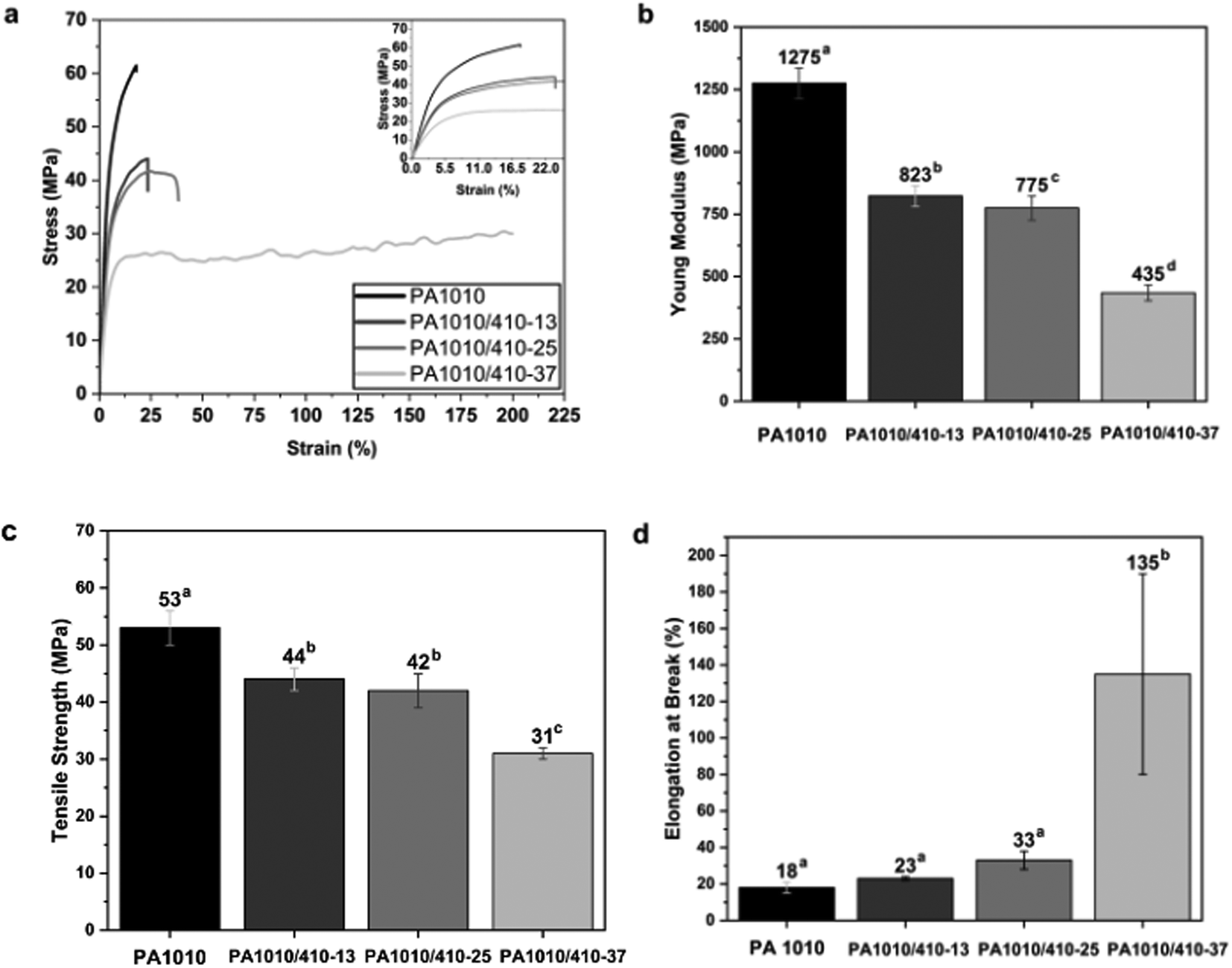 | PA1010/410-37 | 39.7 ± 1.9c | 147.9 ± 1.1d | 61.2 ± 0.5d | 154.0 ± 0.3c | 1.1 ± 0.1b | 179.1 ± 1.2c | −46.5 ± 3.1b | 421.5 ± 0.7a | 469.5 ± 2.4b | 50.9 ± 0.7b | 0.3 ± 0.1a |