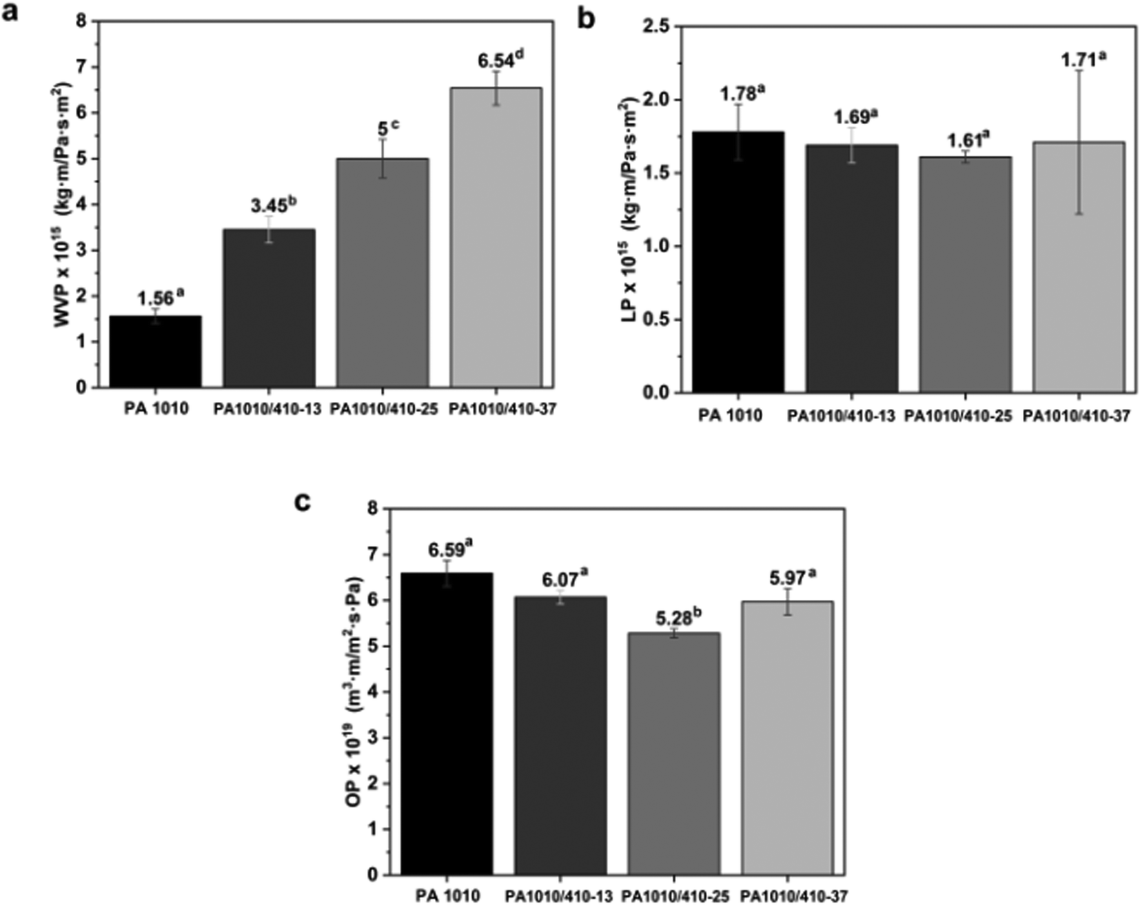 The barrier performance of the PA1010 and PA1010/410 films was also analyzed in terms of their permeability to water and limonene vapors and oxygen gas. Fig. 13 gathers the WVP, LP, and OP values of the bio-based polyamide films, all measured at 25 °C and 53% RH. One can observe that the WVP values increased progressively in the copolyamide films with increasing the putrescine content. This reduction in the water vapor barrier with the 410-unit content increase is related to both the decrease in crystallinity and in the CH2/CONH ratio. The higher CONH densities per unit length of chain, resulting from the higher presence of the amide 410 segments, contributed to the development of a chemical structure that was more affected by water and, hence, by the moisture conditions. Thus, the WVP of PA1010 increased from 1.56 × 10–15 kg m m−2 Pa−1 s−1 up to 6.54 × 10−15 kg m m−2 Pa−1 s−1 for the PA1010/410 with 37.5 mol% of nylon 410. Similar values of permeability were observed by Nguyen et al.56 These permeability values place the here-developed bio-based copolyamide films in between those of PA6 (2.06 × 10−14 kg m m−2 Pa−1 s−1 at 90% HR)57 and PA12 (3.46 × 10−15 kg m m−2 Pa−1 s−1 at 85% HR)58 and only one order of magnitude higher than high-water-vapor-barrier PP (7.26 × 10−16 kg m m−2 Pa−1 s−1 at 90% HR).57 Therefore, these materials show great promise for applications in food environments where moderate or relatively high vapor-barrier performance is needed, such as meat packaging. One can further observe that the permeability to limonene, used habitually as standard to ascertain the barrier to aroma, was not significantly different (p > 0.05) among the bio-based polyamide film samples, with values in the 1.61–1.78 × 10−15 kg m m−2 Pa−1 s−1 range. These values are, for instance, notably lower than those observed for bio-based polyesters, such as PLA (3.3 × 10−15 kg m m−2 Pa−1 s−1) or PHBV (1.0 × 10−14 kg m m−2 Pa−1 s−1), all measured at 40% RH.59 This further confirms the high potential of PA1010 and the PA1010/410 copolyamides, even as monolayer materials, with moisture and aroma resistance for sustainable food packaging applications.