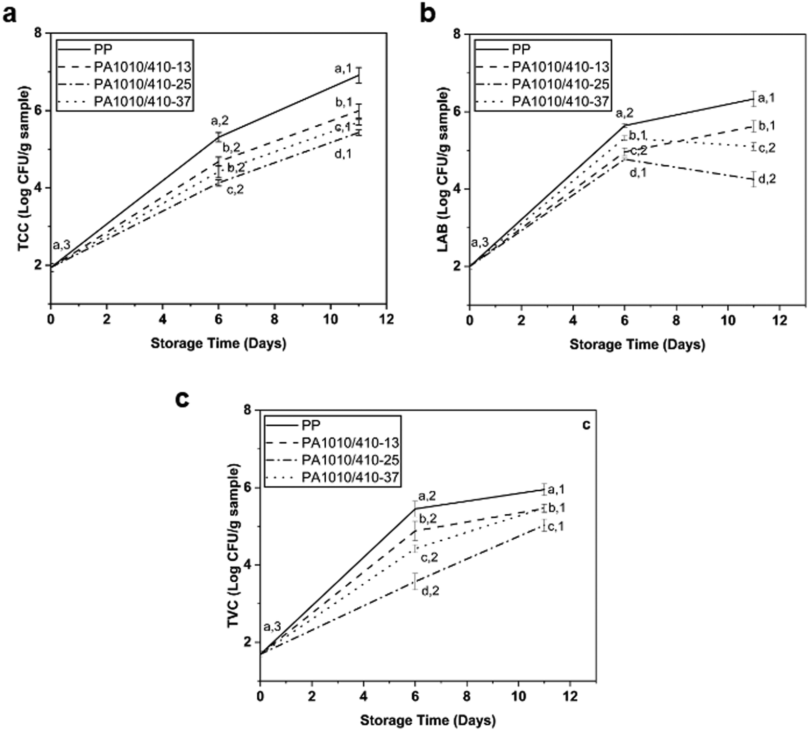 Fig. 14 shows the microbial counts for TCC, LAB, and TVC of minced meat packaged in the food trays prepared with lid films of PA1010/410 and PP films. As recently reported,25,74 the meat samples showed continuous microbial growth during storage, independent of the packaging type. Coliform bacteria are meat quality indicator microorganisms.75 As shown in Fig. 14a, the evolution of TCC was significantly affected (p < 0.05) by film type and storage time. Then, microbial counts of the meat samples packaged with the PP film increased from 1.94 to 5.31 log CFU per g, during the first six days, and to 6.91 log CFU per g at the end of storage (11 days). Similarly, counts increased in the meat samples packaged with the PA1010/410 films to 4.68, 4.13, and 4.42 log CFU per g, during the first week of storage, and to 5.99, 5.43, and 5.70 log CFU per g at the end of storage, for PA1010/410-13, PA1010/410-25, and PA1010/410-37, respectively, showing significant differences among the samples (p < 0.05). These results successfully correlated with the pH trend reported in Table 4. Moreover, the resulting profile of bacterial growth achieved in this packaged meat was in the range of those reported for PA1010 films that preserved pork fillet samples for one week under refrigeration conditions.47
