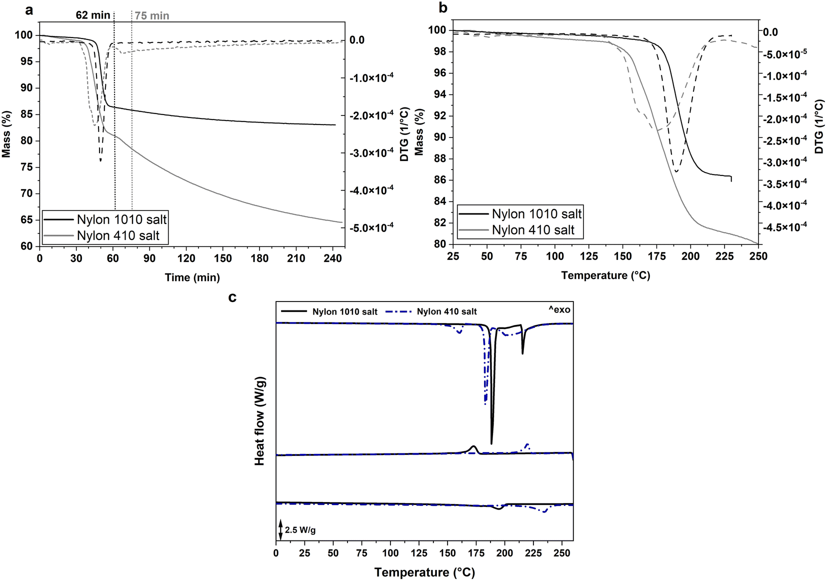 Prior to performing the polymerization reaction, the thermal stability and characteristics of both salts were ascertained by TGA and DSC measurements and the resultant curves are included in Fig. 1. As earlier performed,12 TGA was conducted to simulate the thermal conditions faced during polymerization. One can observe in Fig. 1a that, at these conditions, the setpoint temperature of 230 °C and 250 °C was reached after approximately 62 and 75 min for the nylon 1010 and 410 salts, respectively. Thereafter, at the given setpoint temperatures, the “nylon salt” samples showed respective mass losses of nearly 14% and 19%, respectively. Then, during the isothermal conditions, the mass progressively decreased, after 3 h reaching a value of approximately 83% and 64%, respectively. The mass loss associated to this stage is mainly related to the water released progressively during the growth of the bio-based polyamide chains. However, the absence of a plateau in the case of the nylon 410 salt suggests that thermal degradation occurs simultaneously, differing from the thermal behavior of the nylon 1010 salt. In fact, as one can observe in the TGA curves shown in Fig. 1b, both salts presented a mass loss of ∼1% at 100 °C, ascribed to the evaporation of the remaining solvents or sorbed water. Then, thermal degradation onset was seen to occur in the nylon 1010 and 410 salts at ∼176 °C and ∼150 °C, respectively, which was seen to follow by a sharp peak centered at approximately 189 °C and 179 °C. Therefore, the TGA measurements carried out on the “nylon salts” indicates that the thermal stability of the 410 units is much lower than those of 1010, which may restrict the use of high-temperature conditions during polymerization.