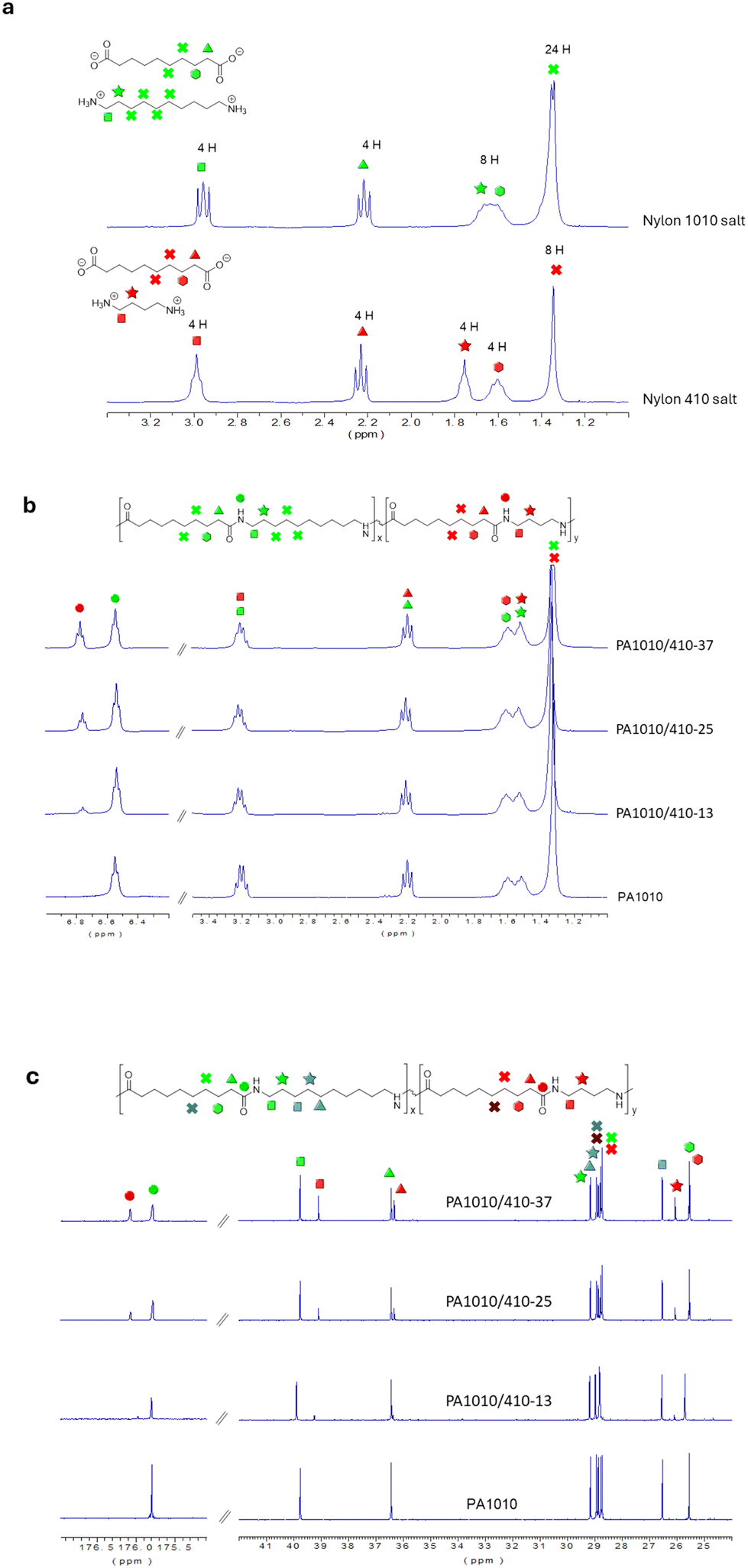 Furthermore, 13C NMR was used for the study of the bio-based copolyamides microstructure. Under these melt polycondensation conditions, amidation and transamidation reactions are both expected to occur at the employed temperatures, potentially leading to a random copolyamide microstructure. In Fig. 2c, one can observe two signals splitting around 39.5 and 36.4 ppm due to the methylene carbons next to the NH and C