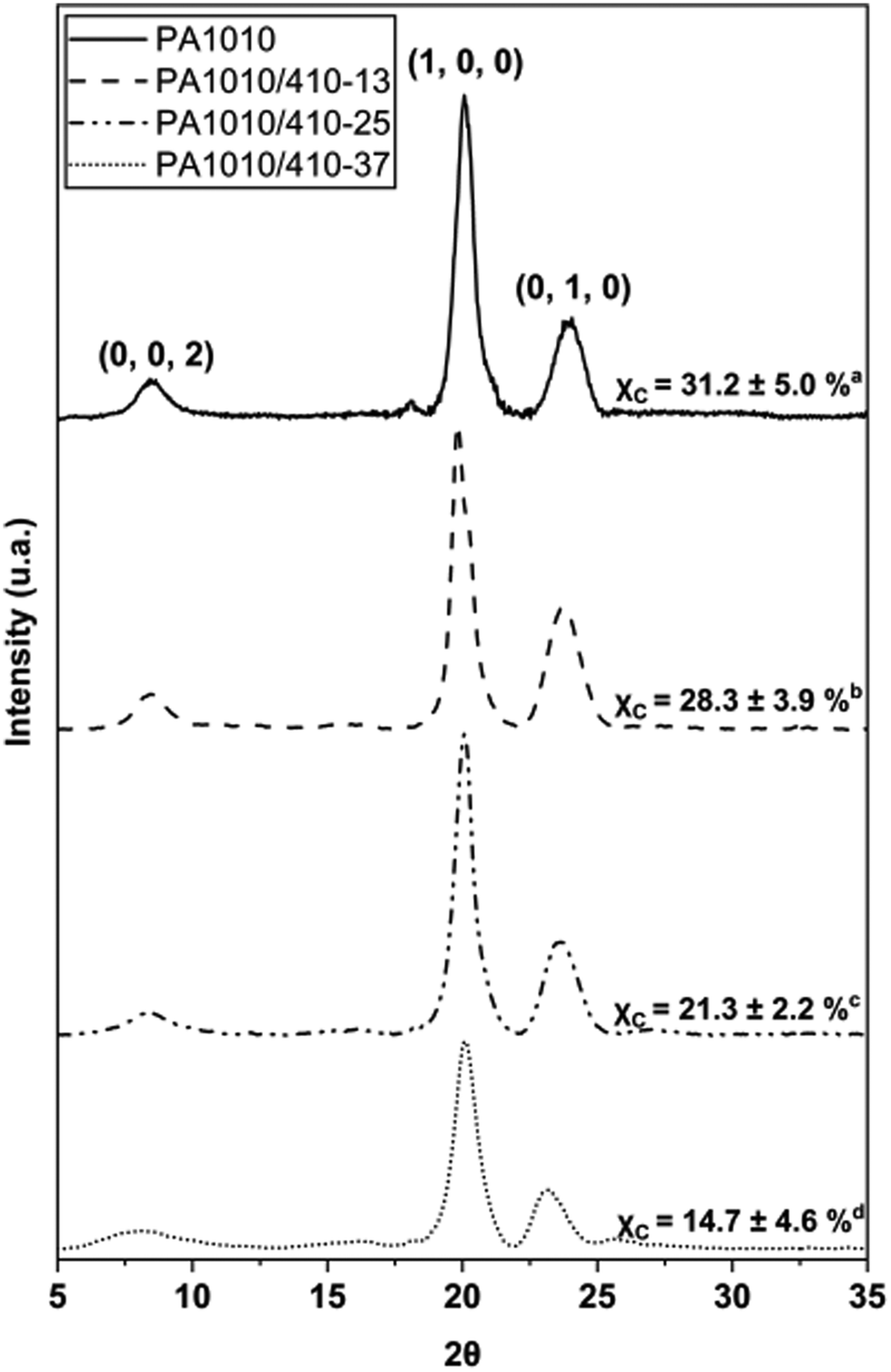Table 1 also includes the VN values attained for the synthesized PA1010 and PA1010/410 with different putrescine contents. The VN of the homopolyamide was 101 ± 1 cm3 g−1, which is lower than that reported earlier for PA1010 (130 ± 5 cm3 g−1).12 This difference can be related to the use of milder conditions during the polymerization reaction. For instance, Li et al.29 reported different viscosity values for polyamide 1214 (PA1214), ranging from 84 to 126 cm3 g−1 due to variations of temperature, pressure, and time. One can observe that the incorporation of the nylon 410 salt resulted in a decrease in the VN to 60 ± 1 cm3 g−1 (PA1010/410 with 12.5 mol% nylon 410) and 63 ± 1 cm3 g−1 (PA1010/410 with 25 mol% nylon 410). Interestingly, further increase in the nylon 410 salt to 37.5 mol% resulted in an increase in the VN value to 75 ± 1 cm3 g−1 (PA1010/410 with 37.5 mol% nylon 410), suggesting superior polyamidation at higher putrescine contents. Similar results were obtained by Rwei et al.20 for copolyamides of nylon 6 (PA6) with N1,N6-bis(4-aminobutyl) adipamide and succinic acid (BABA/SA), observing a reduction in the polyamidation at lower BABA/SA contents followed by an increase at higher contents.