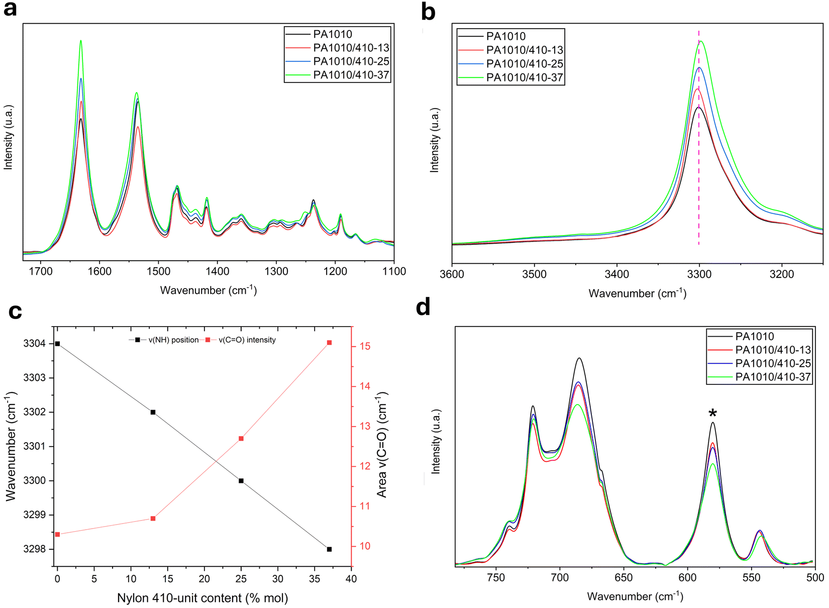 The effect of the nylon 410-unit content on the hydrogen bonding and crystallization behavior of the bio-based polyamides was further elucidated by FTIR analysis and shown in Fig. 5. Thus, Fig. 5a shows a comparison of the FTIR spectra collected at room temperature for PA1010 homopolyamide and all the PA1010/410 copolyamides. In Fig. 5b one can observe that the band positions of the stretching vibrations of N–H, which are influenced by the hydrogen bonding within the PA1010/410 copolyamides, slightly shifted to lower wavenumber with an increase in the proportion of nylon 410 segments. These shifts are indicative of an increase in the overall hydrogen bonding as the nylon 410-unit content in the copolyamide is increased. The expectation would be that this phenomenon would be accompanied by a complementary shift to lower wavenumber of the ν(C