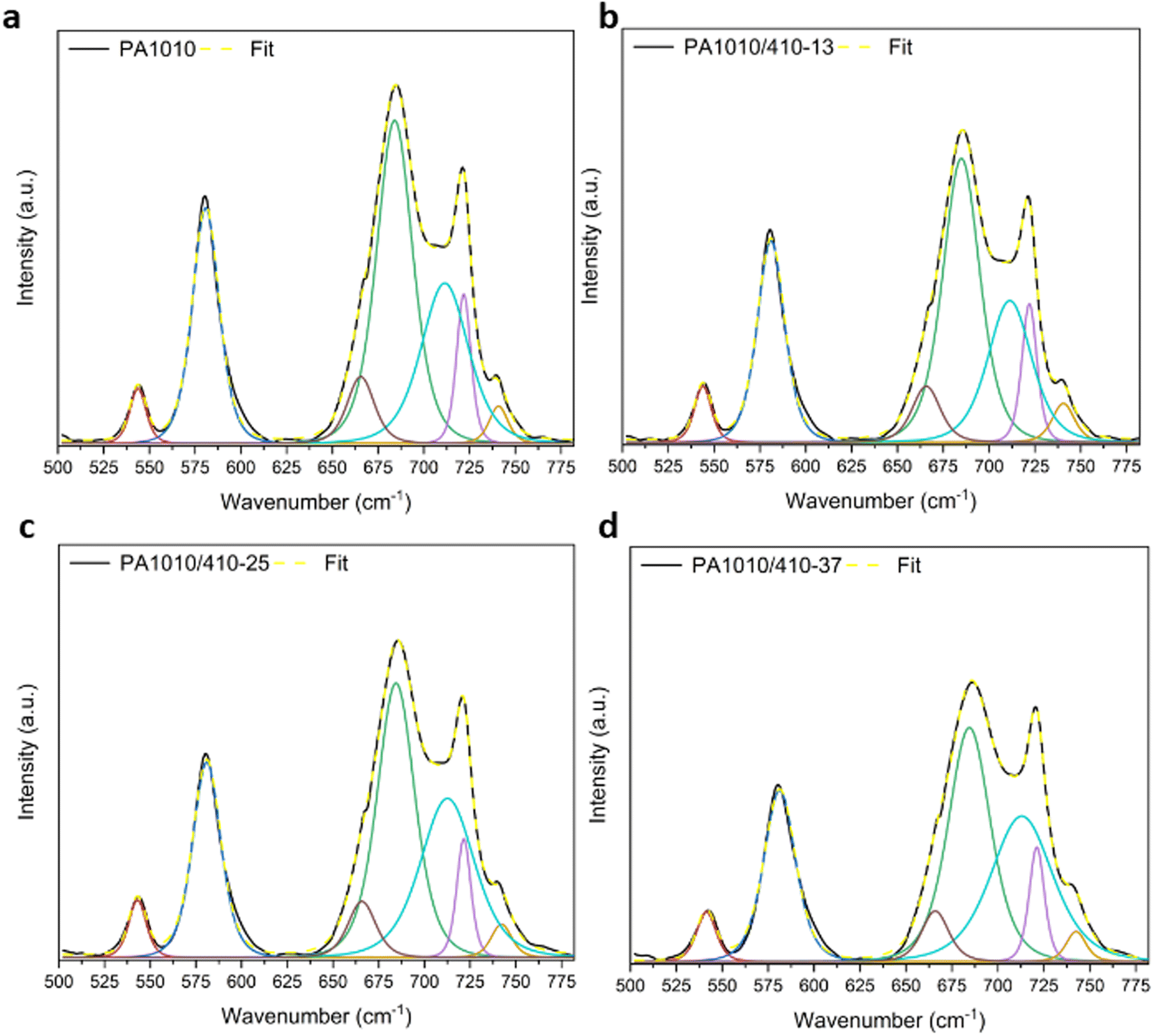 O out-of-plane mode) ∼580 cm−1, typical of the planar zig-zag structure of the α-form of nylon 1010.41 The amide V band was seen to decrease in intensity and broaden (cf. FWHM of 23.5 cm−1 for PA1010 versus 26.5 cm−1 for PA1010/410-37) with increased nylon 410-unit content. This band intensity reduction further confirms the above-described reduction in crystallinity with increased nylon 410-unit content. Similarly, the amide VI band was also seen to decrease in intensity and broaden as a function of increased PA410-unit content (cf. FWHM of 17.1 cm−1 for PA1010 versus 20.4 cm−1 for PA1010/410-37). Using the intensity of the isolated amide VI band, which is free of interference or contribution of other surrounding bands, and the measured crystallinity of the PA1010 sample taken as reference, one can calculate the crystallinity of the copolyamides. To this end, the bands in the FTIR spectra between 780–500 cm−1 were deconvoluted (see Fig. 6). Thus, crystallinity of the copolyamides were calculated as 27.0%, 25.9%, and 22.1% for PA1010/410-13, PA1010/410-25, and PA1010/410-37, respectively. These values are comparable to those generated previously from the WAXD data.