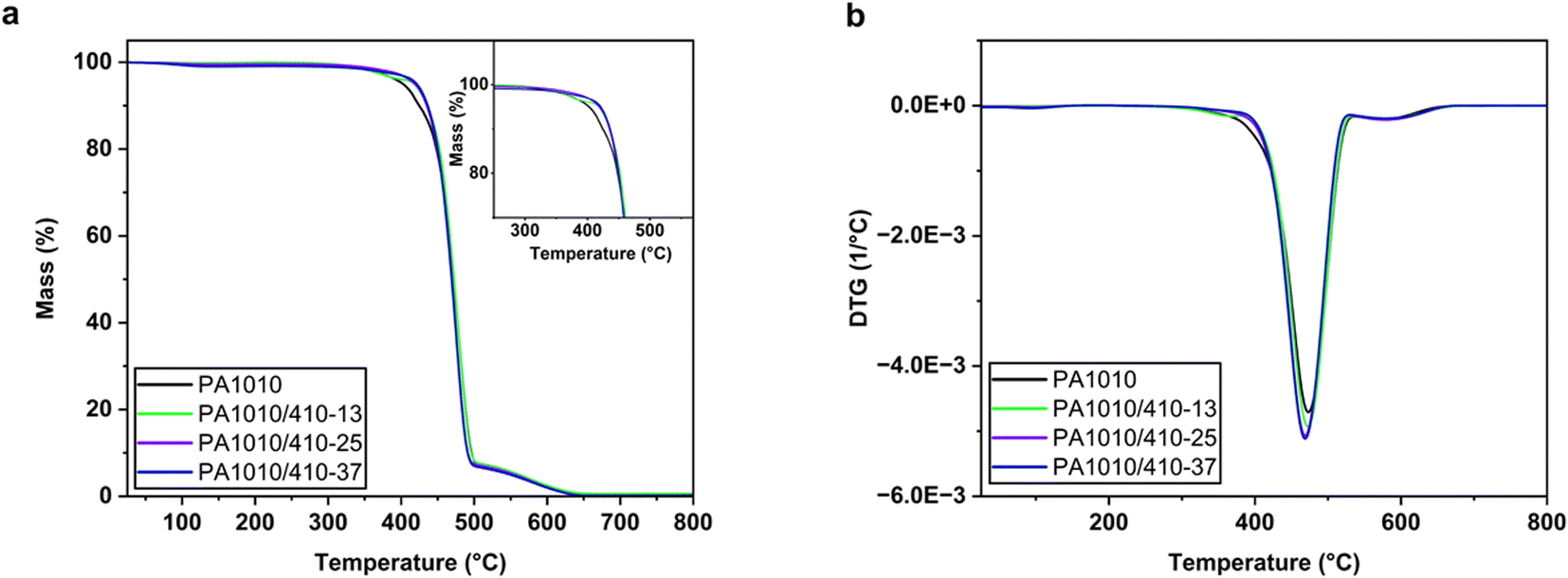 | Fig. 7 (a) Thermogravimetric analysis (TGA) and (b) derivative thermogravimetric analysis (DTGA) of polyamide 1010 (PA1010) and copolyamides 1010/410 (PA1010/410) films. | ||