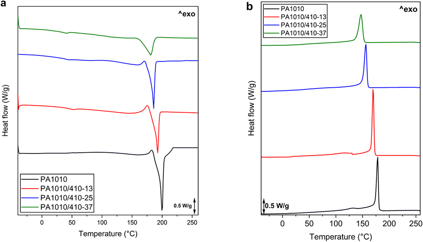 | Fig. 8 Differential scanning calorimetry (DSC) curves corresponding to (a) first heating and (b) cooling of polyamide 1010 (PA1010) and copolyamides 1010/410 (PA1010/410) films. | ||