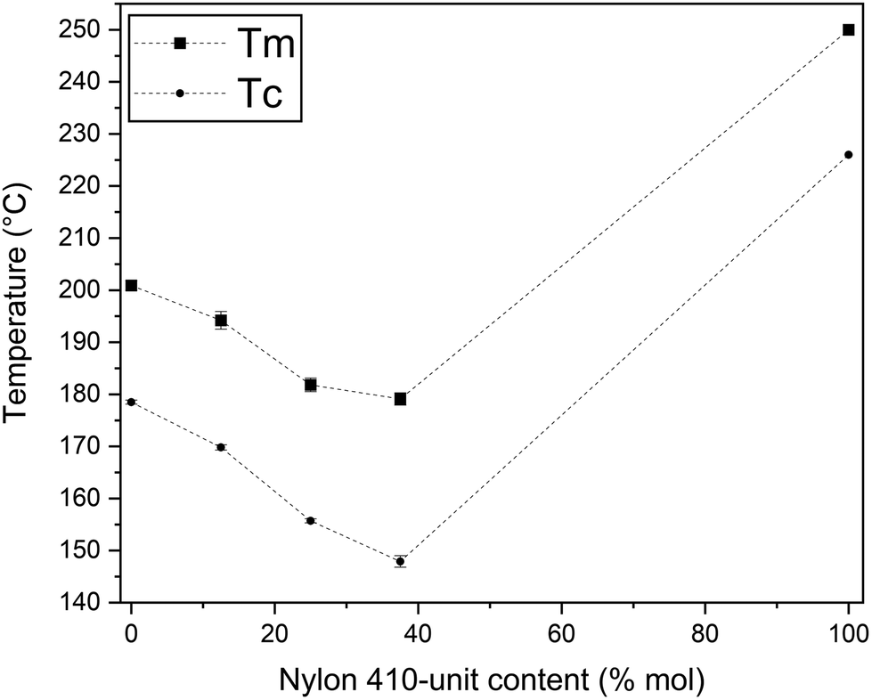 From the above, it was seen that the bio-based copolyamides crystallized in the entire composition range studied herein. However, the crystallization/melting of random copolymers is a complex function of the chemical structure of the repeating units involved, molar ratio of comonomers, and MW. Indeed, the thermal transitions determined by non-isothermal DSC experiments indicate that these copolyamides show isodimorphic behavior with a moderate amount of comonomer exclusion.44 In this regard, one can observe in Fig. 9 that the bio-based polyamides presented first-order thermal transition (TC and Tm) values with non-linear dependence on molar composition: PA1010 (∼178.5 and 201 °C), PA1010/410-13 (∼169 and 194 °C), PA1010/410-25 (∼156 and 182 °C), PA1010/410-37 (∼148 and 179 °C), and PA410 (∼226 and 250 °C).45 Therefore, the comonomers crystallized in the same crystal lattice, but with partial inclusion of nylon 410-units in the unit cell of nylon 1010. From the plots, it can be inferred that both 410- and 1010-units were hosted in the PA1010/410 crystals, but these were characterized by a PA1010-rich crystalline phase with a “pseudo-eutectic” region in the 25–37 mol% range. At this molar composition, the melting point of the PA1010 phase was depressed by the presence of nylon 410-units down to a temperature of approximately 180 °C.