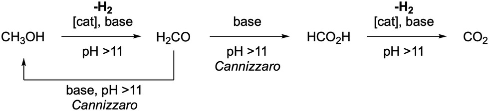 | | Scheme 3 Possibility of a shift to the Cannizzaro reaction as a competing pathway during methanol dehydrogenation under strongly basic conditions. | |