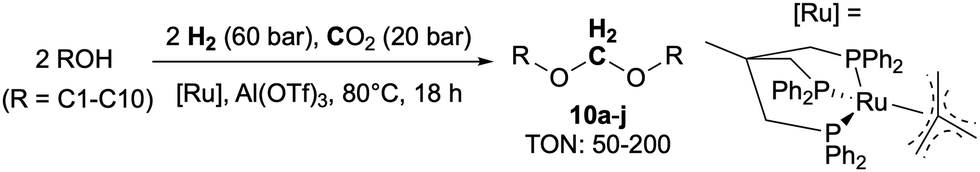 A report by Klankermayer, Leitner and co-workers58 demonstrated the reduction of carbon dioxide to the formaldehyde-level in alcohols (C1–C10) enabling access to dimethoxymethane (DMM 10a) and other oxymethylene ethers (OME 10b–10j). In their study, a molecular ruthenium-triphos catalyst in the presence of a Lewis acid (Al(OTf)3) was active to realise the formation of the OME at 80 °C within 18 h (CO2 = 20 bar; H2 = 60 bar; Scheme 8).