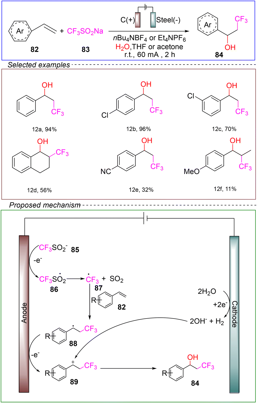 The Kappe group reported an electrochemical trifluoromethylation reaction of styrene. In a non-divided cell, a graphite rod was used as the anode and steel served as the cathode. Using 4-tert-butyl styrene 82 as the model substrate, NaSO2CF3 was employed to provide CF3 radicals, while nBu4NBF4 or Et4NPF6 served as the electrolyte. A mixed solvent of THF or acetone and water was used for the reaction. Conducted at room temperature with a constant current of 60 mA for 2 hours, the reaction successfully achieved trifluoromethylation (Scheme 12).100