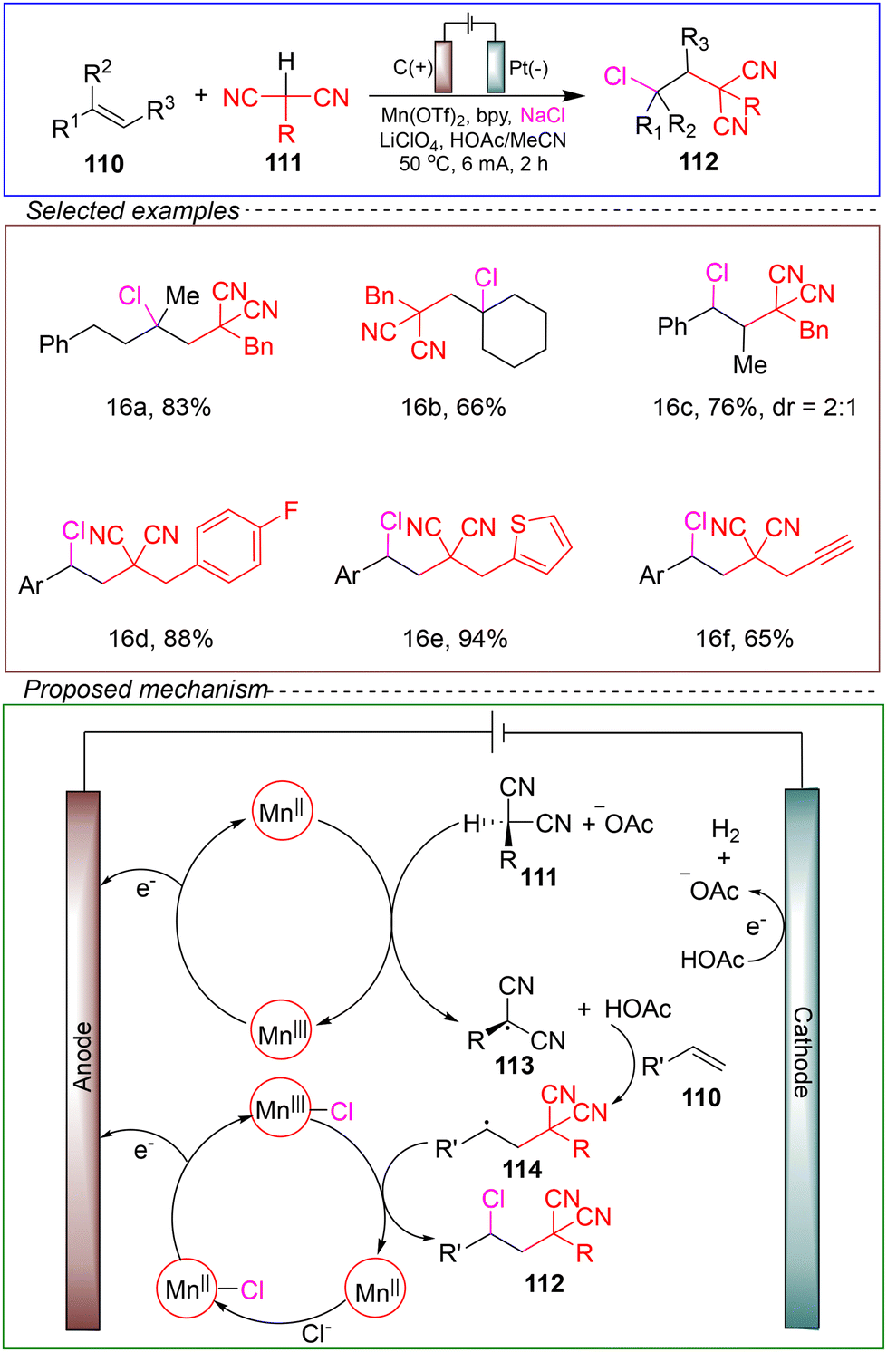 Lin's research group accomplished anodic-coupled electrolysis for the regioselective chloroalkylation of alkenes. They conducted the reaction by using 4-tert-butylstyrene as a model substrate, benzylic acetonitrile as a CN source and NaCl as a Cl source in a non-split cell with a carbon anode and a platinum cathode. Mn(OTf)2 was used as a precatalyst, 2,2-bipyridine (bpy) as a ligand and LiClO4 as an electrolyte. The chloroalkylation reaction was successfully achieved under a constant current of 6 mA at 50 °C in a mixed solvent of HOAc and MeCN for 2 hours (Scheme 16).110