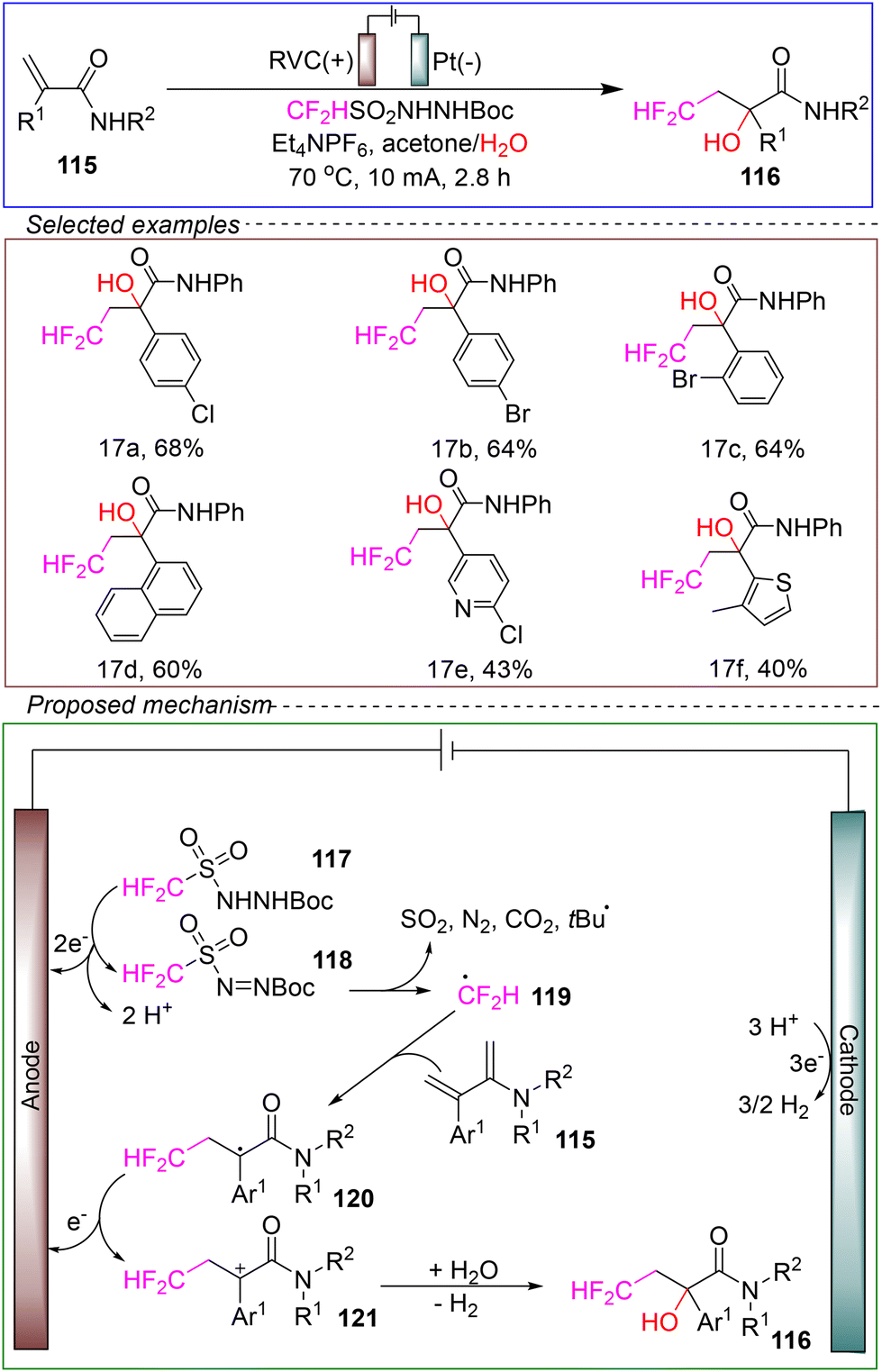 Based on several control experiments, the proposed mechanism is as follows. Reagent 117 underwent anodic oxidation at the anode to generate diazene 118, which subsequently decomposed to form the difluoromethyl radical (˙CF2H) 119. The radical addition of acrylamide 120 to the anode and its one-electron oxidation resulted in the formation of the α-carbonyl carbocation 121. The Ar1 group stabilized the carbon cation, which was crucial for the oxidation of the electron-deficient carbon radical 120. Lastly, carbocation 121 reacted with water to yield the alkene difunctionalization product 116.