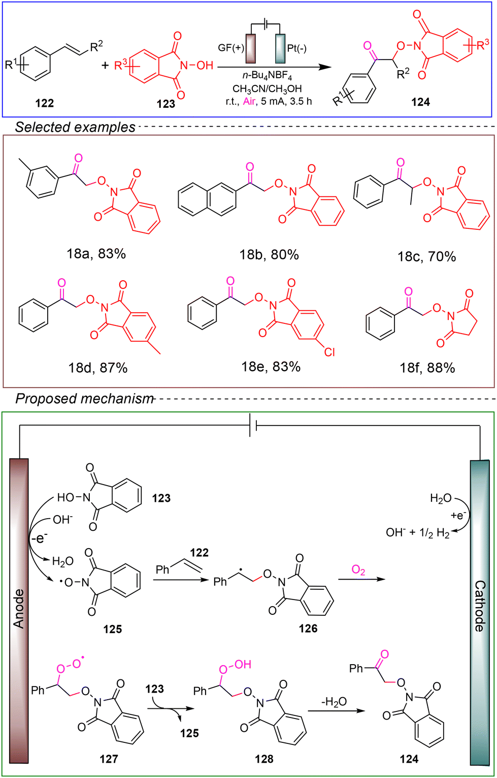 The involvement of radical intermediates in the reaction was confirmed through control experiments and isotope labeling. It was demonstrated that oxygen, rather than water, participated in the reaction. CV showed that the N-hydroxyphthalimide 123 was preferentially oxidized in the electrochemical reaction. Based on the above information, a plausible mechanism can be proposed. Initially, the hydroxide anion could be easily reduced from H2O on the cathode. In this reaction, N-hydroxyphthalimide 123 undergoes a proton-coupled oxidation process at the anode, facilitated by hydroxide, resulting in the formation of the N-oxyl radical 125. This radical then adds to styrene, generating the stable carbon radical 126. The carbon radical 126 readily reacts with the oxygen in air, leading to the formation of the peroxo radical 127. Subsequently, the peroxo radical 127 abstracts a hydrogen atom from either N-hydroxyphthalimide 123 or the solvent, producing the corresponding hydroperoxide 128. Finally, hydroperoxide 128 eliminates a molecule of H2O, yielding the target product 124.