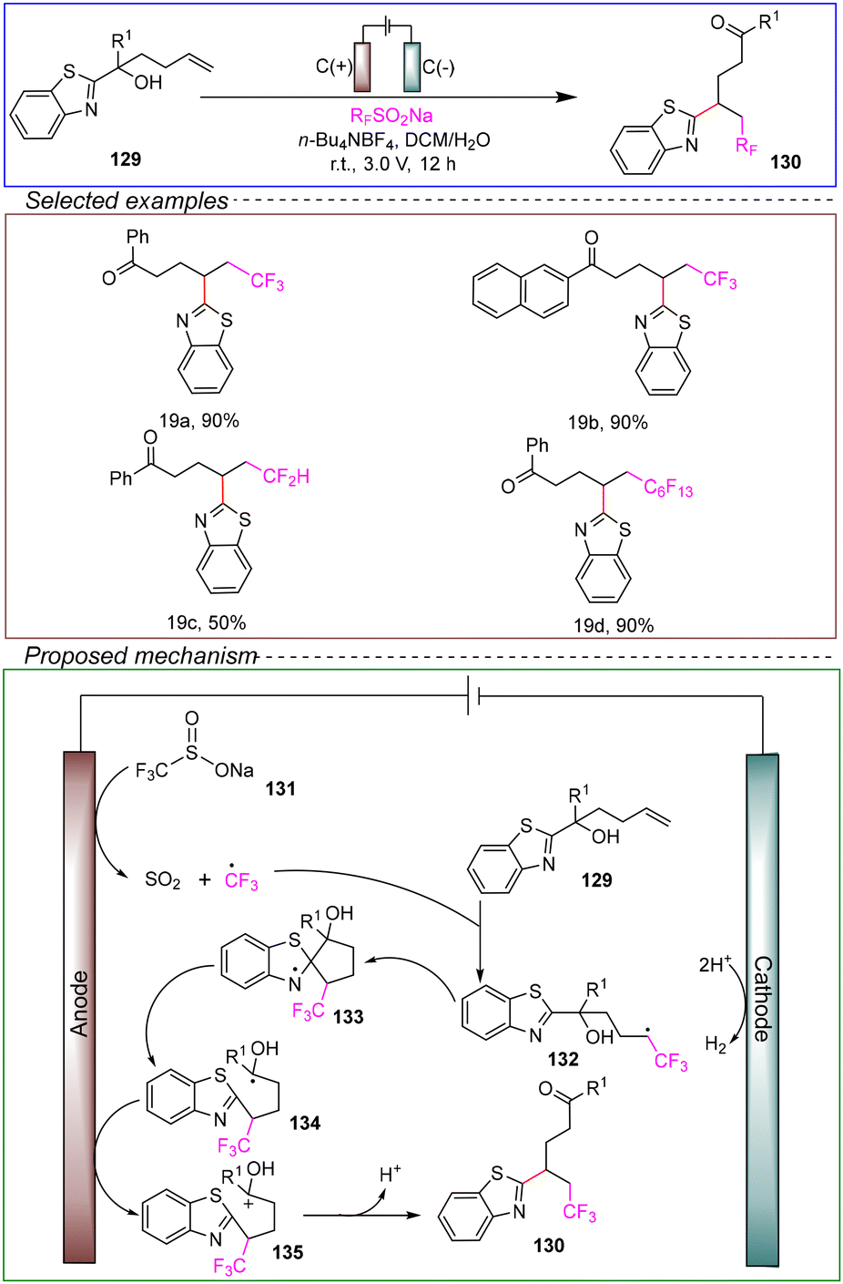 They demonstrated through radical trapping experiments and CV that radical intermediates were involved in the reaction, and NaSO2CF3131 underwent preferential anodic oxidation. Based on the above information, the proposed mechanism could be outlined as follows. Initially, the CF3 radical is generated from 131via anodic oxidation. The addition of the tertiary alcohol 129 leads to the formation of the carbon radical intermediate 132, which rapidly attacks the heteroarene, resulting in the formation of the cyclic nitrogen radical intermediate 133. This cyclic intermediate undergoes fast ring opening followed by radical β-cleavage, yielding the stabilized radical intermediate 134. Intermediate 134 is then oxidized at the anode to form carbocation 135. Finally, deprotonation of carbocation 135 produces the heteroaryl migrated product 130.