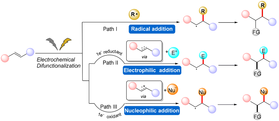In the context of radical-mediated processes (Fig. 1), the electrochemical difunctionalization of alkenes can be achieved through three main pathways. The first strategy involves the oxidation of a nucleophilic reagent at the anode to generate a radical intermediate. The radical intermediate then undergoes addition to the alkene, forming a carbon-centered radical intermediate. Subsequently, the carbon-centered radical intermediate is oxidized at the anode to generate a carbocation, which finally reacts with the nucleophilic reagent to yield the desired product (as shown in Scheme 1, Pathway I).11–16 The second strategy involves the oxidation of an alkene at the anode to generate a radical cation. The nucleophilic reagent then adds to the radical cation, forming a carbon-centered radical intermediate. The carbon-centered radical intermediate is subsequently oxidized to generate a carbocation, which reacts with the nucleophilic reagent to produce the final product (as shown in Scheme 1, Pathway II).17–28 The third strategy involves the reduction of an alkene at the cathode to generate a radical anion. The electrophilic reagent then adds to the radical anion, forming a carbon-centered radical intermediate. The carbon-centered radical intermediate is further reduced to generate a carbanion, which reacts with the electrophilic reagent to generate the final product (as shown in Scheme 1, Pathway III).29–31