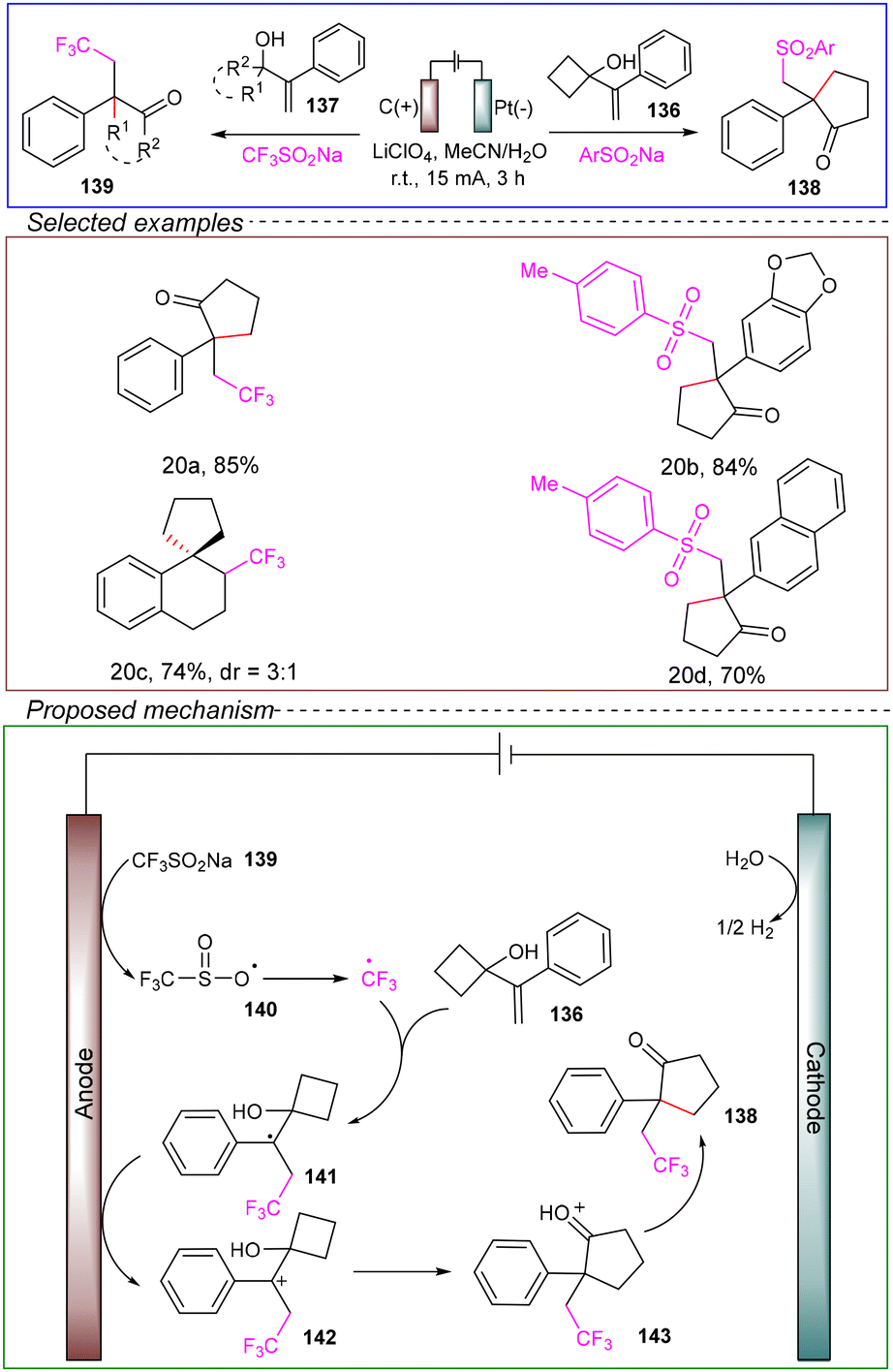 Chen's research group successfully conducted the trifluoromethyl/sulfonyl semi-pyran rearrangement of allyl alcohol using sodium trifluoromethanesulfonate and aryl sulfonate salts. In a non-divided cell with a carbon anode and a platinum cathode, allyl alcohol 136 served as the model substrate, with CF3SO2Na acting as the source of trifluoromethyl radicals. Lithium perchlorate was used as the electrolyte and a mixture of acetonitrile and water served as the solvent. The reaction was performed at room temperature under a constant current of 15 mA for 3 hours, successfully achieving the trifluoromethyl/sulfonyl semi-pyran electrochemical rearrangement (Scheme 20).126