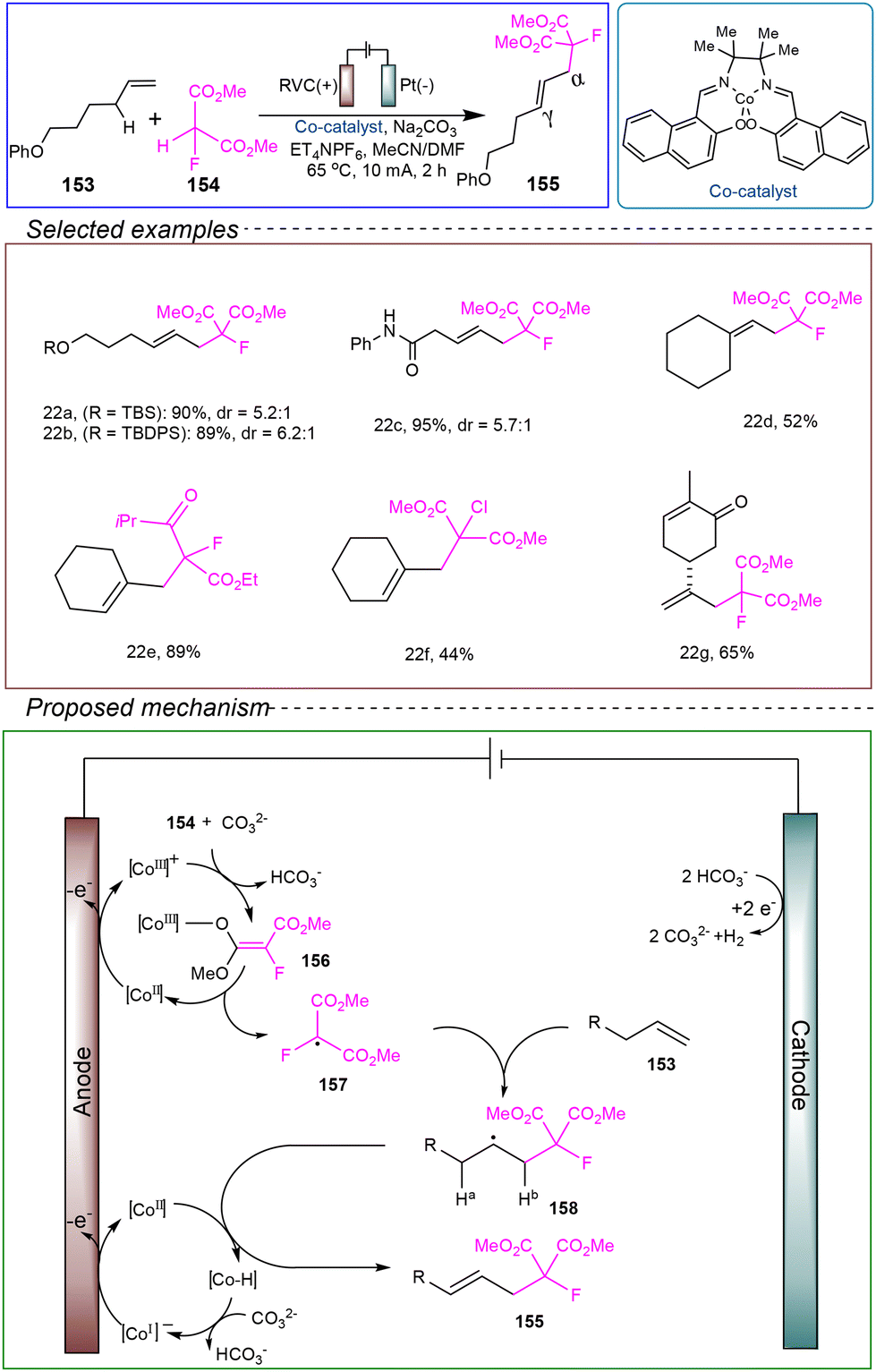 The Xu group reported an electrocatalytic allylic alkylation reaction. They utilized an undivided cell with a RVC anode and a platinum cathode, using α-olefins 153 and 2-fluoropropionic acid esters 154 as model substrates, with Co-catalyst selected for catalysis. Et4NPF6 served as the electrolyte, while Na2CO3 acted as a basic additive, and a mixed solvent of MeCN and DMF was employed. Under conditions of 65 °C and a constant current of 10 mA, the reaction was successfully conducted for 2 hours to achieve the allylic alkylation reaction (Scheme 22).128