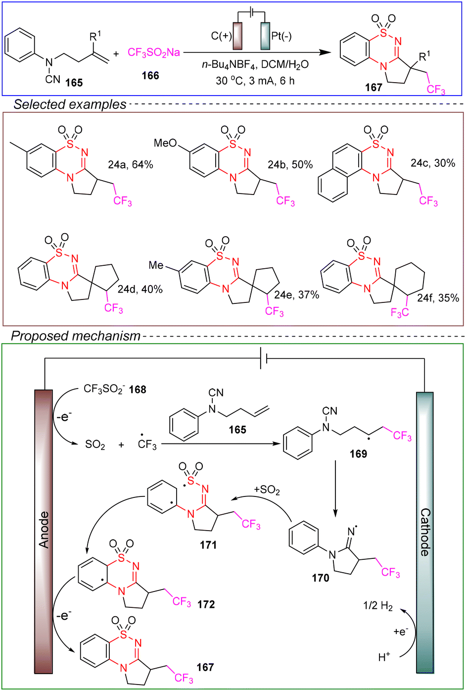 Liao's group achieved an electrochemical tandem trifluoromethylation cyclization reaction. They conducted the reaction in a non-divided cell with a carbon anode and a platinum cathode, using N-(but-3-en-1-yl)-N-phenylcyanamide 165 as the model substrate and CF3SO2Na 166 as the source of the trifluoromethyl radical. n-Bu4NBF4 was used as the electrolyte, and a mixture of DCM and water served as the solvent. The reaction was performed at 30 °C under a constant current of 3 mA for 6 hours, successfully achieving trifluoromethylation cyclization (Scheme 24).136