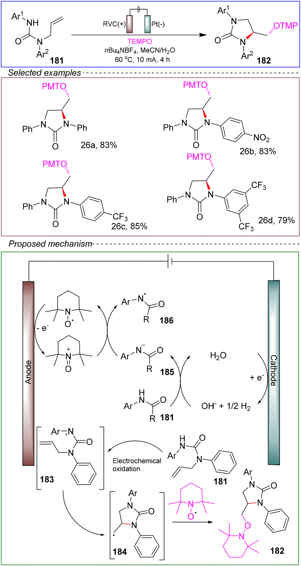 Based on these control experiments and cyclic voltammetry tests, the following reaction mechanism has been proposed: using urea as a substrate 181. The process begins with the anodic oxidation of TEMPO, generating ammonium ions, while the cathodic reduction of H2O produces OH− and H2. Substrate 181 is then deprotonated by the electro-generated hydroxide to form a nitrogen-containing anion 185, which acts as a better electron donor than the neutral precursor. SET occurs between the nitrogen-containing anion 185 substrate and the ammonium ion, providing a radical with a deficit of electrons at the nitrogen center and regenerating the TEMPO radical. Subsequently, the nitrogen radical intermediate can cyclize onto the urea ring, generating another radical at the terminal carbon, which reacts with the TEMPO radical molecule to form the bifunctional product 182.