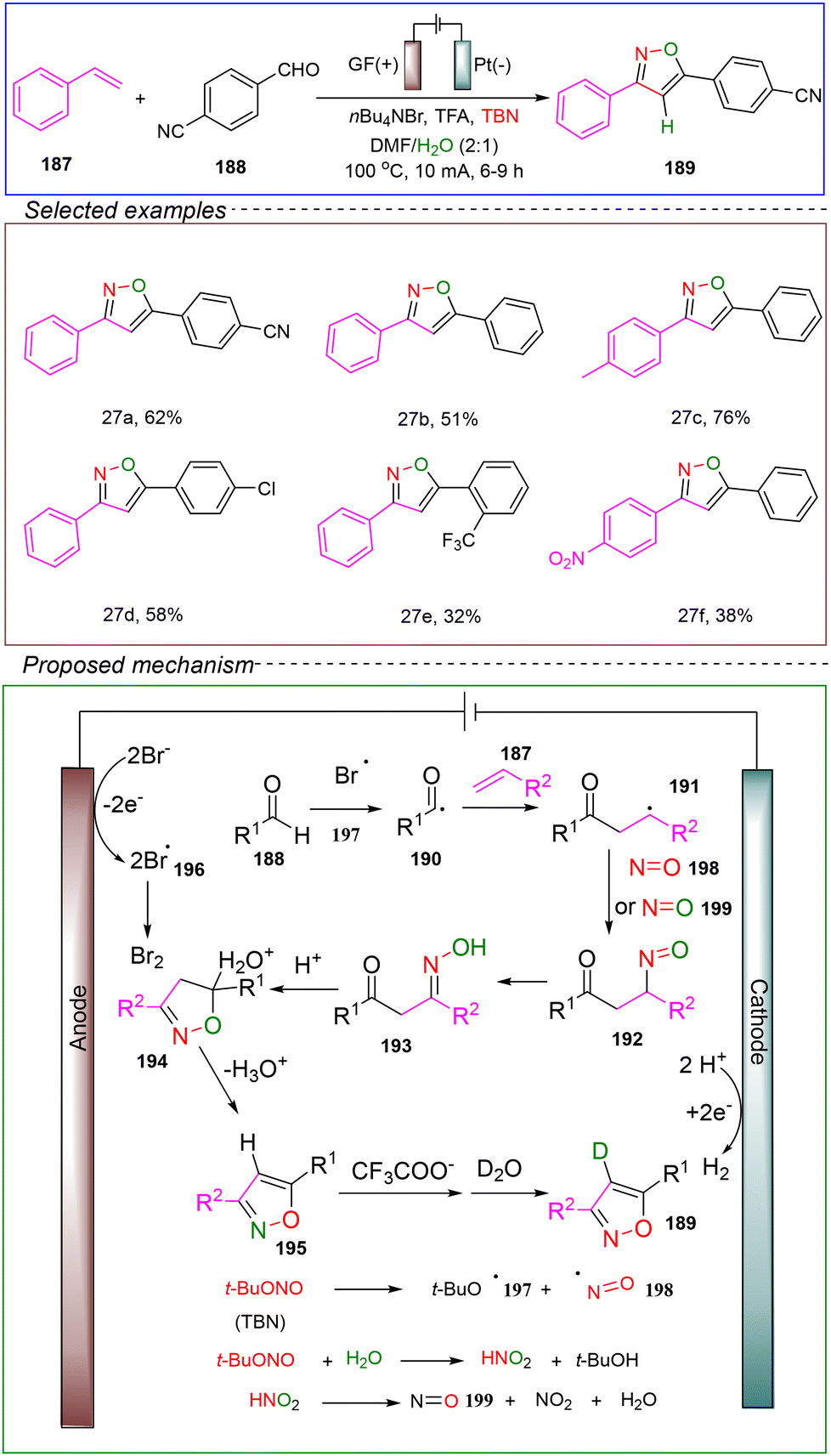 A detailed mechanism was proposed through isotopic labeling, kinetic studies, CV analysis, and investigations into the reactivity of intermediates. Initially, bromide ions from the electrolyte are oxidized at the anode to generate the bromine radical 196. Concurrently, under thermal conditions, TBN undergoes homolysis to produce radicals 197 and 198. The reaction began with the formation of the acyl radical 190, which results from the in situ reaction of aldehyde 189 with radical 196 or 197. Subsequently, radical 190 attacks the double bond of the alkene, generating the carbon-centered radical 191. With the assistance of nitroso radicals 198 or 199, compound 192 is formed. This is followed by an isomerization process, rapidly leading to the key intermediate β-carbonyl ketoxime 193. The addition of TFA promotes the dehydration of intermediate 193, facilitating the formation of the required isoxazole 195. Under the influence of carboxylate ions, 195 may experience hydrogen loss at the 4-position of the isoxazole framework. It can then extract a proton from a deuterated water molecule, leading to the formation of the deuterated fragment 189.