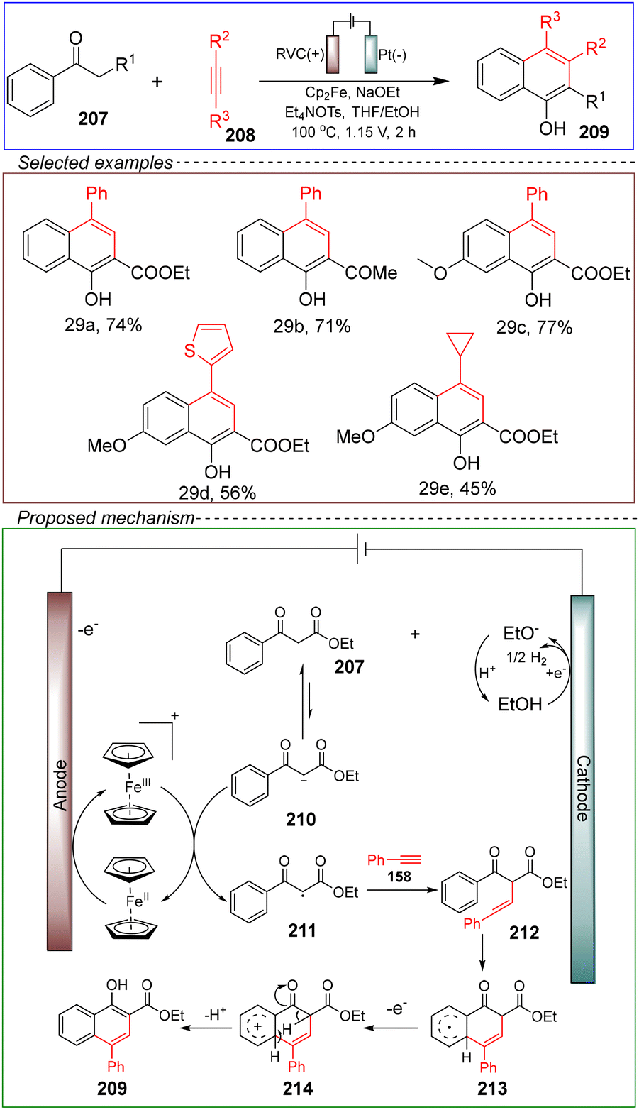 Through variable control and CV experiments, the mechanism proposed was as follows. Under electrochemical conditions, ethanol undergoes a reduction reaction at the cathode, generating an ethoxy anion and H2. The ethoxy anion reacts with the 1,3-dicarbonyl compound 207 to form the carbon intermediate 210. The ethoxy anion is derived from the reduction of ethanol and the addition of NaOEt. Meanwhile, at the anode, Cp2Fe is oxidized to Cp2Fe+, which is further oxidized to intermediate 210, generating the C-radical intermediate 211. This radical intermediate 161 then reacts with acetylene 208 to form intermediate 212, which undergoes intermolecular cyclization to yield intermediate 213. Finally, oxidation leads to intermediate 214, which undergoes deprotonation to produce 1-naphthol 209. The released protons can combine with the ethoxy anion to complete the reaction cycle.