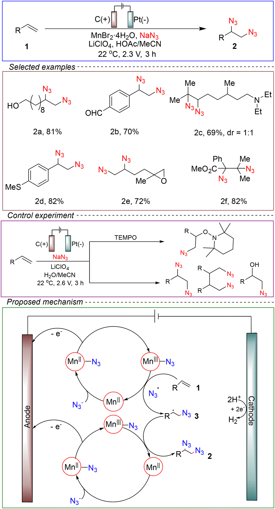 Lin and co-workers achieved the electrochemical synthesis of ortho-azido diamines for the first time. In a non-divided cell, a carbon felt anode and a platinum cathode were used. Using alkene 1 and sodium azide as model substrates, manganese bromide as the catalyst, and LiClO4 as the electrolyte, a mixed solvent of acetonitrile and acetic acid was employed. The reaction was conducted at a constant voltage of 2.3 V for 3 hours at 22 °C, successfully achieving the electrochemical synthesis of ortho-azido diamines (Scheme 2).44
