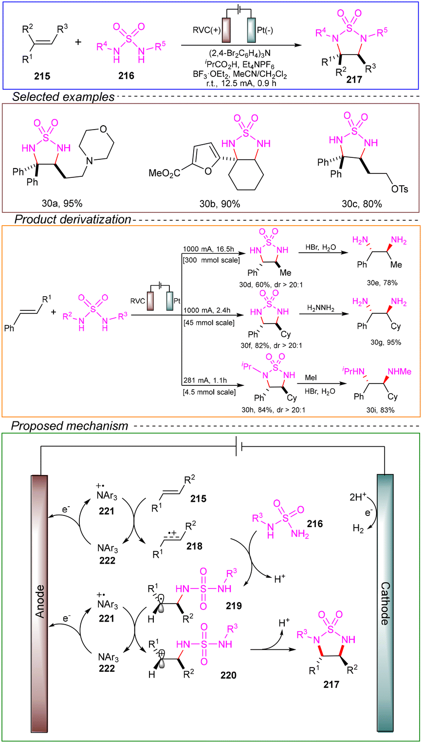 Through variable control and CV experiments, the proposed reaction mechanism was as follows. Substrate 219 undergoes single-electron transfer oxidation by oxidant 221, generating carbocation 220. This carbocation can then cyclize to form the cyclic sulfonamide 217. The cyclization of 220 plays a crucial role in controlling the stereoselectivity of the 1,2-diamination, as the substituents R1 and R2 on the alkene are situated on opposite sides of the newly formed five-membered ring, reducing steric hindrance. Electrons lost from the alkene to the anode ultimately combine with protons at the cathode to form H2, eliminating the need for external electron and proton acceptors.