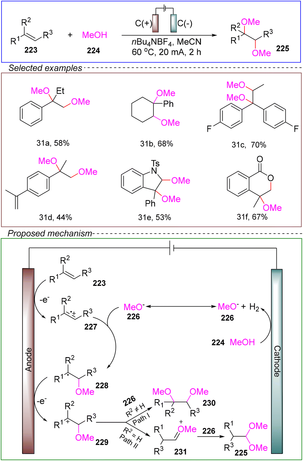 Xu's group developed an electrochemical dimethoxylation reaction of alkenes. In a non-divided cell with platinum as both the anode and cathode, they used 1,1-diphenylethylene 223 and methanol 224 as model substrates, with n-Bu4NBF4 as the electrolyte and acetonitrile as the solvent. The reaction was conducted at 60 °C under a constant current of 20 mA for 2 hours, successfully achieving dimethoxylation (Scheme 31).174