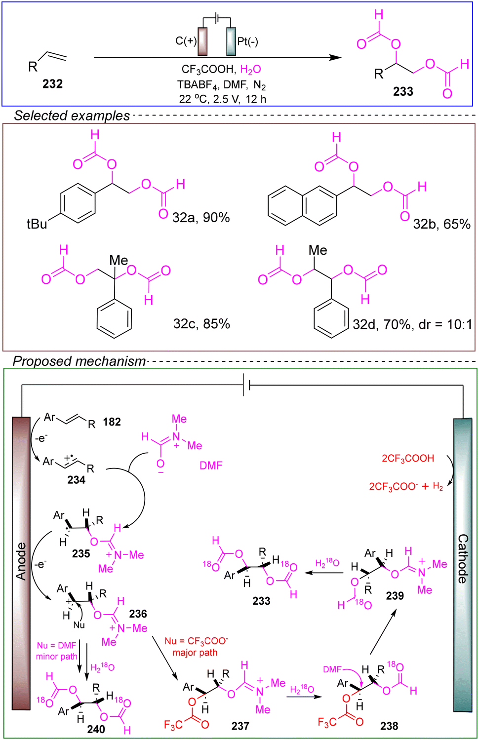 This method provided a practical and convenient strategy for the stereoselective dimethoxylation of protected syn-1,2-diol derivatives since the methoxyl groups could be easily converted to hydroxyl groups. The proposed mechanism first involved the oxidation of olefins to radical cations at an appropriate reaction potential. The radical cation was then captured by DMF to form a carbon-centered radical, which further was oxidized to a cation at the anode surface. On the one hand, intermediate 235 reacted with DMF as the nucleophile in the presence of water to yield an anti-dimethoxylation product with a leaving group of HNMe2. It is noteworthy that this pathway is not considered as a major process due to the production of by-products. On the other hand, intermediate 236 was trapped by a better nucleophile, trifluoroacetic acid, to form intermediate 237. Finally, the target stereoselective dimethoxylation product was formed via nucleophilic substitution and hydrolysis processes. Undoubtedly, the observed highly non-enantioselective product could be attributed to the formation of intermediate 237, which occurred before the non-enantioselective control erosion caused by the rotation of the C–C bond.