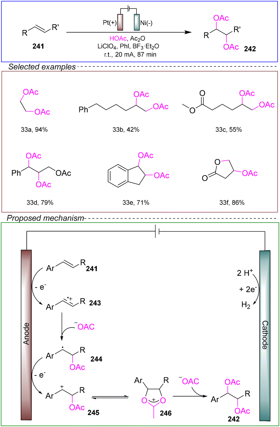 In 2023, De Vos and co-workers reported a highly effective electrocatalytic diacetoxylation method. They utilized an undivided cell with a platinum anode and a nickel cathode, using 1-octene 241 as the model substrate, PhI as the catalyst, and a mixture of BF3·Et2O and LiClO4 as the electrolyte. A solvent mixture of acetic acid and acetic anhydride was employed. Under these conditions, the reaction was carried out at room temperature with a constant current of 20 mA for 87 minutes, achieving the diacetoxylation reaction (Scheme 33).176