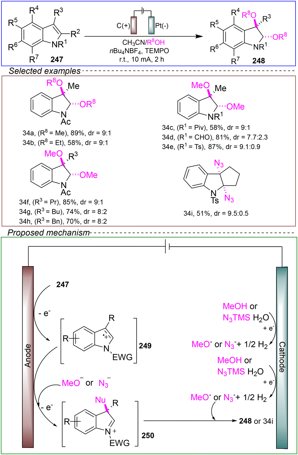 The proposed reaction mechanism was elucidated through CV and control experiments. Initially, the N-substituted indole 247 undergoes direct oxidation at the anode to form the radical cation intermediate 249. Methoxy or azide anions generated at the cathode can react at the C3 position of 249 while oxidation occurs at the anode. This process can occur simultaneously or can involve the initial addition of a nucleophile to 249, generating a radical intermediate that is subsequently oxidized. The resulting cationic intermediate 250 is captured by another methoxy or azide molecule, ultimately leading to the formation of either 248 or 34i, as these products are more stable. In the case of 3-substituted indoles, methoxy or azide groups preferentially trans-add to avoid electronic repulsion. This reaction contrasts with the diazotization reactions developed by Lin for alkenes, where oxidative catalysis involving NaN3 transfers azide–manganese radicals that add to alkenes, followed by capture by a second azide–manganese radical.