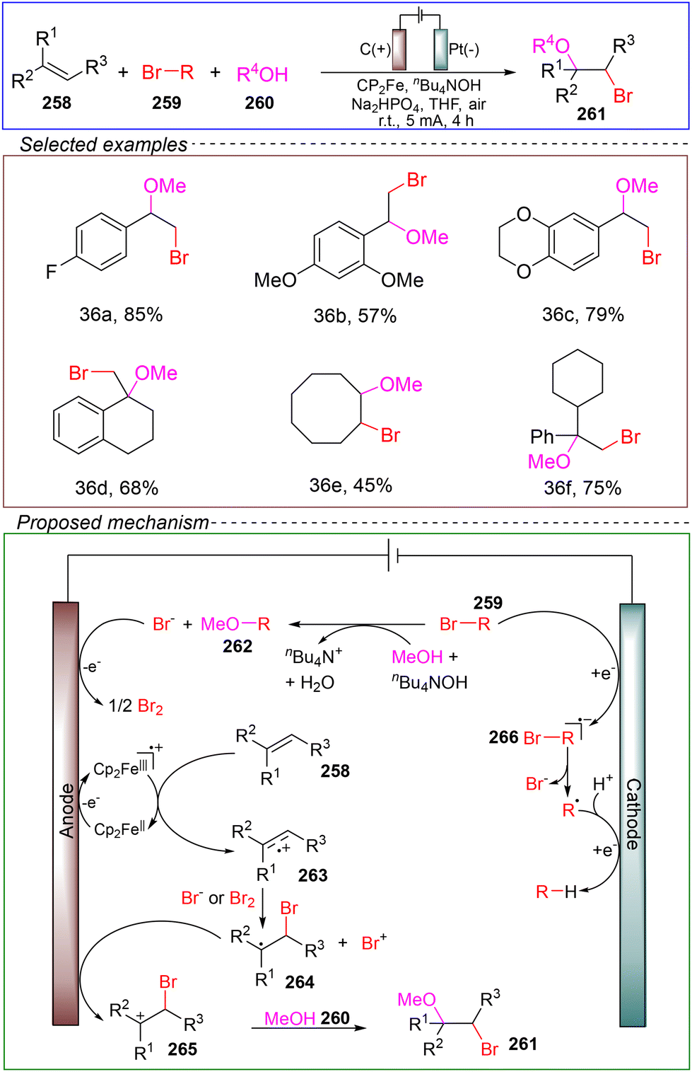 Additionally, Luo and co-workers successfully implemented the electrochemical alkoxylation of alkenes with organic halides. In a non-divided cell with a graphite rod as the anode and a platinum plate as the cathode, they used 1-methoxy-4-vinylbenzene 258, diethyl 2-bromosuccinate 259, and methanol 260 as model substrates. Tetra-n-butylammonium hydroxide (n-Bu4NOH) served as the electrolyte, Cp2Fe acted as the catalyst, and sodium hydrogen phosphate (Na2HPO4) was used as an additive, with THF as the solvent. The reaction was conducted at room temperature with a constant current density of 5 mA for 4 hours, successfully achieving the alkoxylation reaction (Scheme 36).179