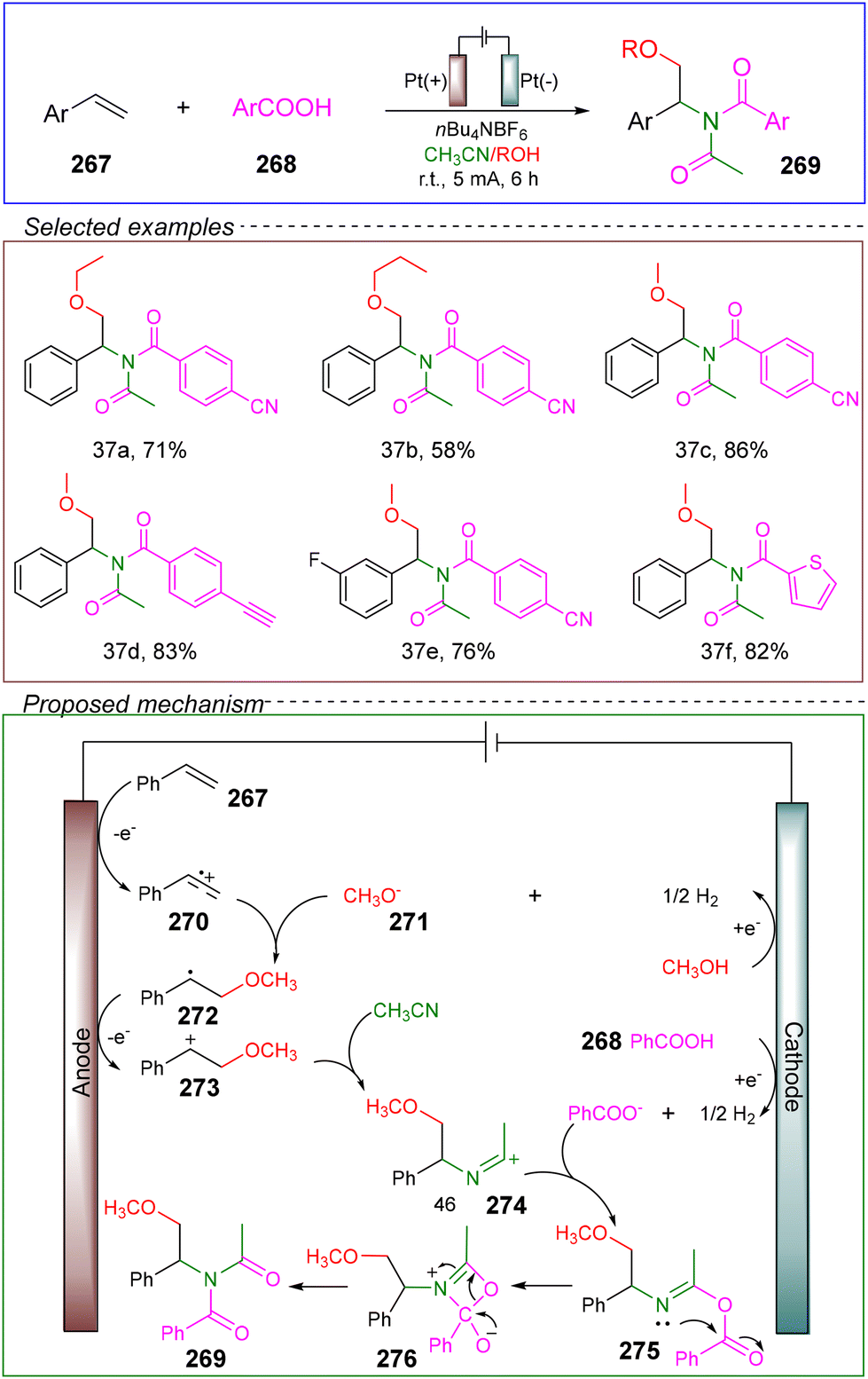 Based on control experiments and CV studies, the proposed reaction mechanism was as follows. Initially, styrene 267 undergoes anodic oxidation through single-electron transfer to generate the radical cation 270. This cation then undergoes nucleophilic addition with CH3O−, produced by the cathodic reduction of methanol, leading to the formation of the carbon-centered radical 272. Subsequently, anodic oxidation yields another carbocation, 273. This cation is captured by acetonitrile, resulting in carbocation 274, which can effectively combine with the PhCOO− generated from the cathodic reduction of benzoic acid. Finally, due to its structural instability, intermediate 275 quickly undergoes the Mumm rearrangement to yield the desired product 269.