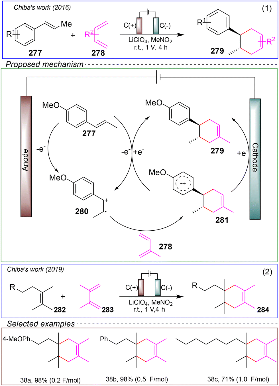 Based on control experiments, DFT calculations, and CV studies, the proposed reaction mechanism was as follows. The aromatic radical cation 281 forms an intermolecular C–C bond with isoprene 278 through the radical cation 280 generated from the anethole at the anode, as its oxidation potential is higher than that of 277. Subsequently, the aromatic radical cation 281 can oxidize the starting trans-anethole 277 while triggering a radical cation chain mechanism, ultimately yielding the final product 279 at the cathode.