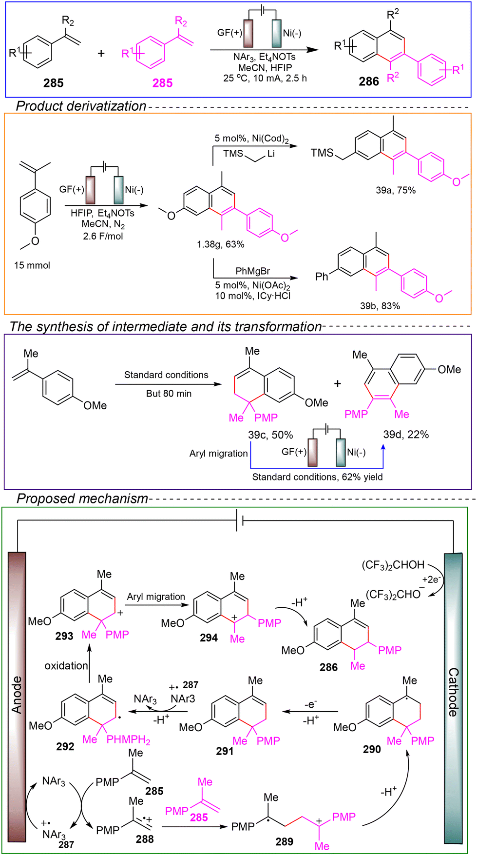 Undoubtedly, the electrochemical activation of radical cation-mediated cyclizations has significantly enriched the substrate diversity of Diels–Alder reactions. These reactions predominantly yield non-conjugated six-membered ring products via [4 + 2] cyclization. The Ye research group has described a novel electrochemical [4 + 2] cyclization involving two variants of aryl alkenes. In a non-divided cell with GF as the anode and a nickel plate as the cathode, they utilized 4-methoxy-α-methylstyrene 285 as the model substrate, with HFIP as the co-solvent, TBPA as the medium, Et4NOTs as the electrolyte, and acetonitrile as the solvent. The reaction was conducted at room temperature under a constant current of 10 mA for 2.5 hours, successfully achieving electrochemical [4 + 2] cyclization–rearrangement–aromatization (Scheme 39).183