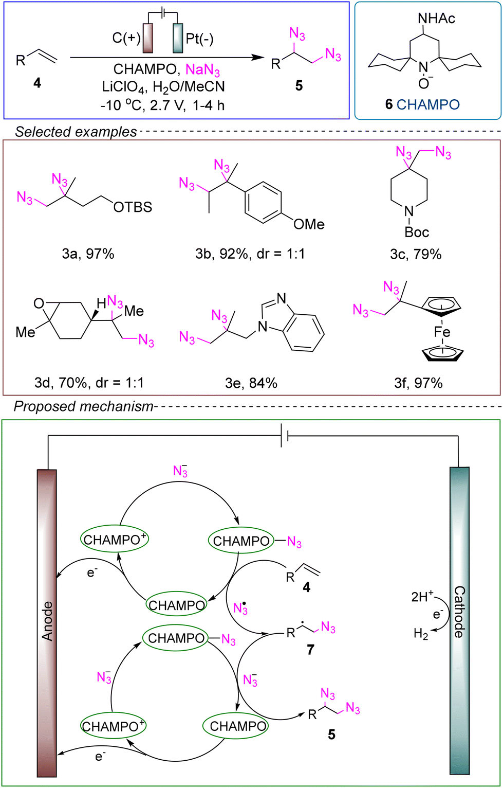 The Kim group developed a novel electrochemical synthesis method that did not require transition metal catalysts. They utilized an undivided cell with a glassy carbon anode and a platinum cathode, employing alkene 4 as the model substrate, NaN3 as the source of diazo radicals, and LiClO4 as the electrolyte. Cyclohexane-based (4-acetamidopiperidin-1-yl)oxy (CHAMPO) 6 served as the catalyst, and a mixed solvent of MeCN and H2O was used. Under conditions of −10 °C and a constant voltage of 2.7 V, the reaction was successfully conducted for 1 to 4 hours to achieve diazotization (Scheme 3).45