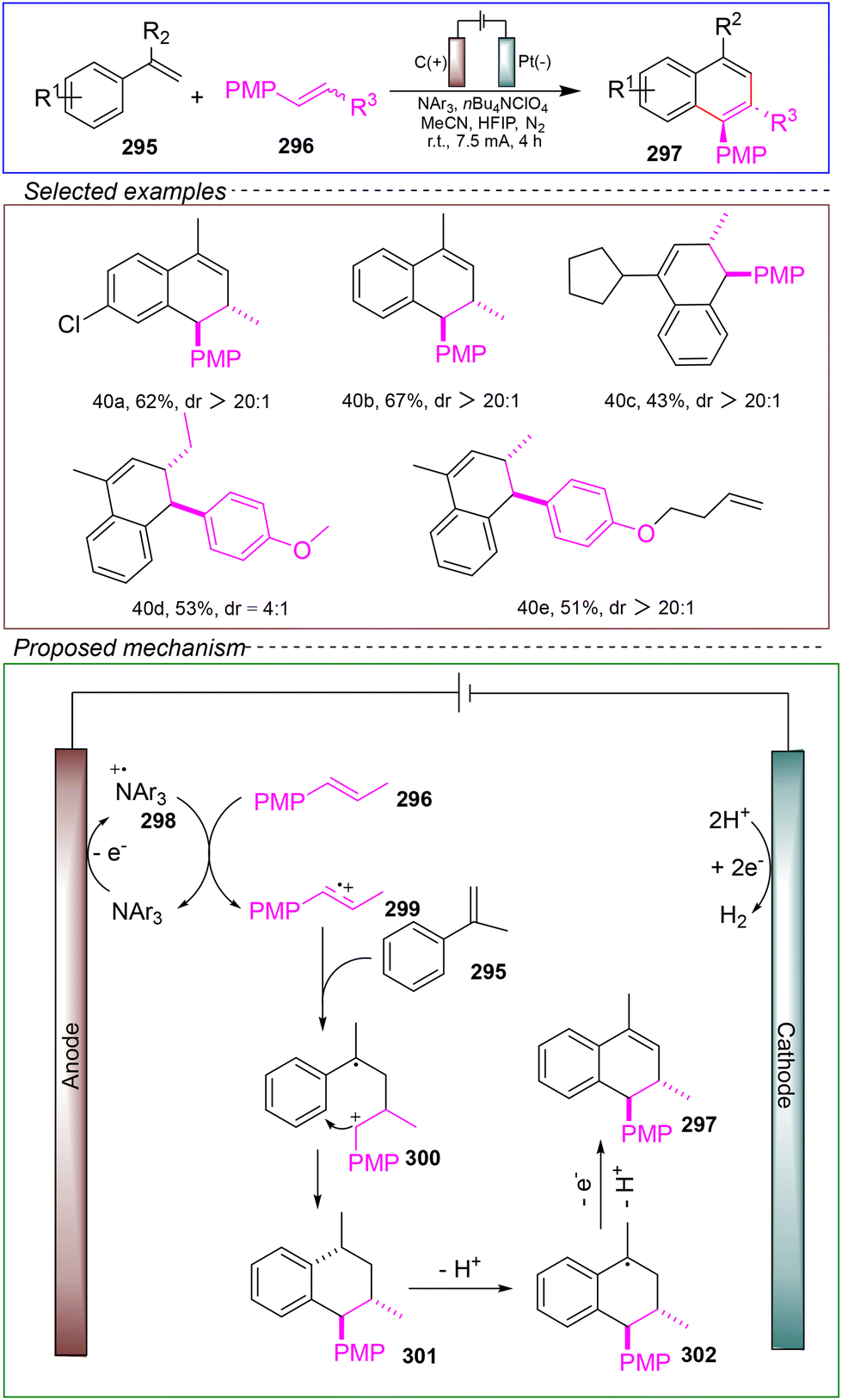 The Lei group employed a similar strategy to synthesize poly-substituted 1,2-dihydronaphthalenes. In a non-divided cell with a carbon cloth anode and a platinum plate cathode, they used α-methylstyrene 295 and the trans-anethole 296 as model substrates, with HFIP as a co-solvent and tri(4-bromophenyl) amine [(4-BrPh)3N] as the medium. Tetra-n-butylammonium perchlorate (n-Bu4NClO4) served as the electrolyte, and a mixed solvent of acetonitrile and hexafluoroisopropanol was used. Under a constant current of 7.5 mA at room temperature for 4 hours, the electrochemical [4 + 2] cyclization successfully produced poly-substituted 1,2-dihydronaphthalenes (Scheme 40).184