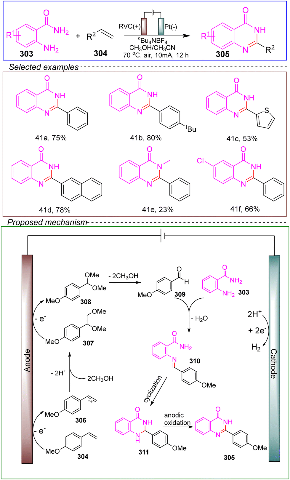 Pan and co-workers reported a reaction for synthesizing quinazolinone derivatives via anodic oxidation. In a non-divided cell with a RVC anode and a platinum cathode, they utilized 2-aminobenzamide 303 and styrene 304 as model substrates, with n-Bu4NBF4 as the electrolyte, and a mixed solvent of acetonitrile and methanol. The reaction was conducted at 70 °C under a constant current of 10 mA for 12 hours, successfully achieving the cyclization (Scheme 41).194