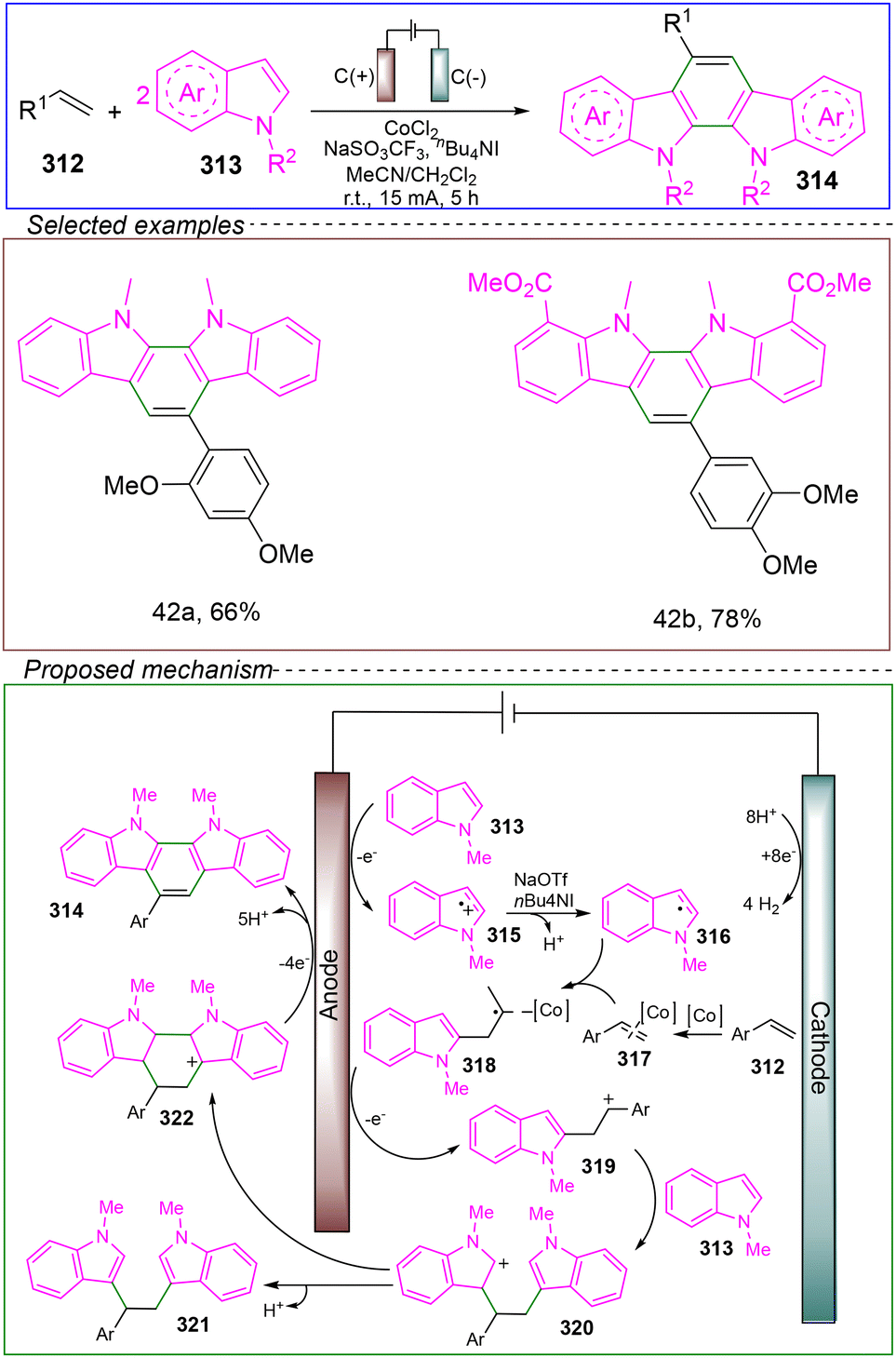 Based on control experiments and CV studies, the proposed mechanism was as follows. The anodic oxidation of indole 313 generates the indole radical cation intermediate 315. Under the basic conditions of the NaOTf/n-Bu4NI mixed electrolyte, deprotonation occurs sequentially, forming the indole carbon-centered radical intermediate 316. In the Co–alkene complex 317, radical intermediate 316 adds to the C