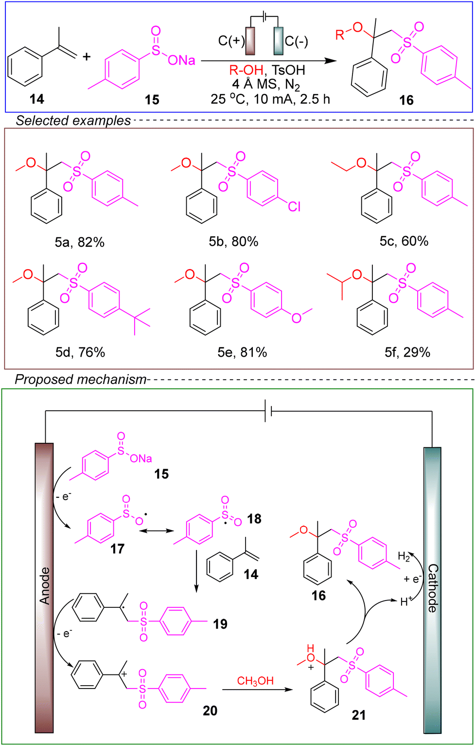Using a variable control method, the researchers added the radical inhibitor TEMPO and observed complete inhibition of the reaction, indicating that a radical pathway is involved in the electrochemical transformation. They proposed the following mechanism: sodium p-toluenesulfonate 15 is oxidized at the graphite anode to generate radical 17, which readily undergoes tautomerization to form sulfonyl radical 18. The sulfonyl radical 18 then adds to the C–C double bond of α-methylstyrene 14 to generate the alkyl radical 19. Subsequently, the radical intermediate 19 is anodically oxidized to form the alkyl cation 20, which undergoes a nucleophilic attack with methanol to generate intermediate 21, leading to the target product 16 and the release of H2 at the cathode.