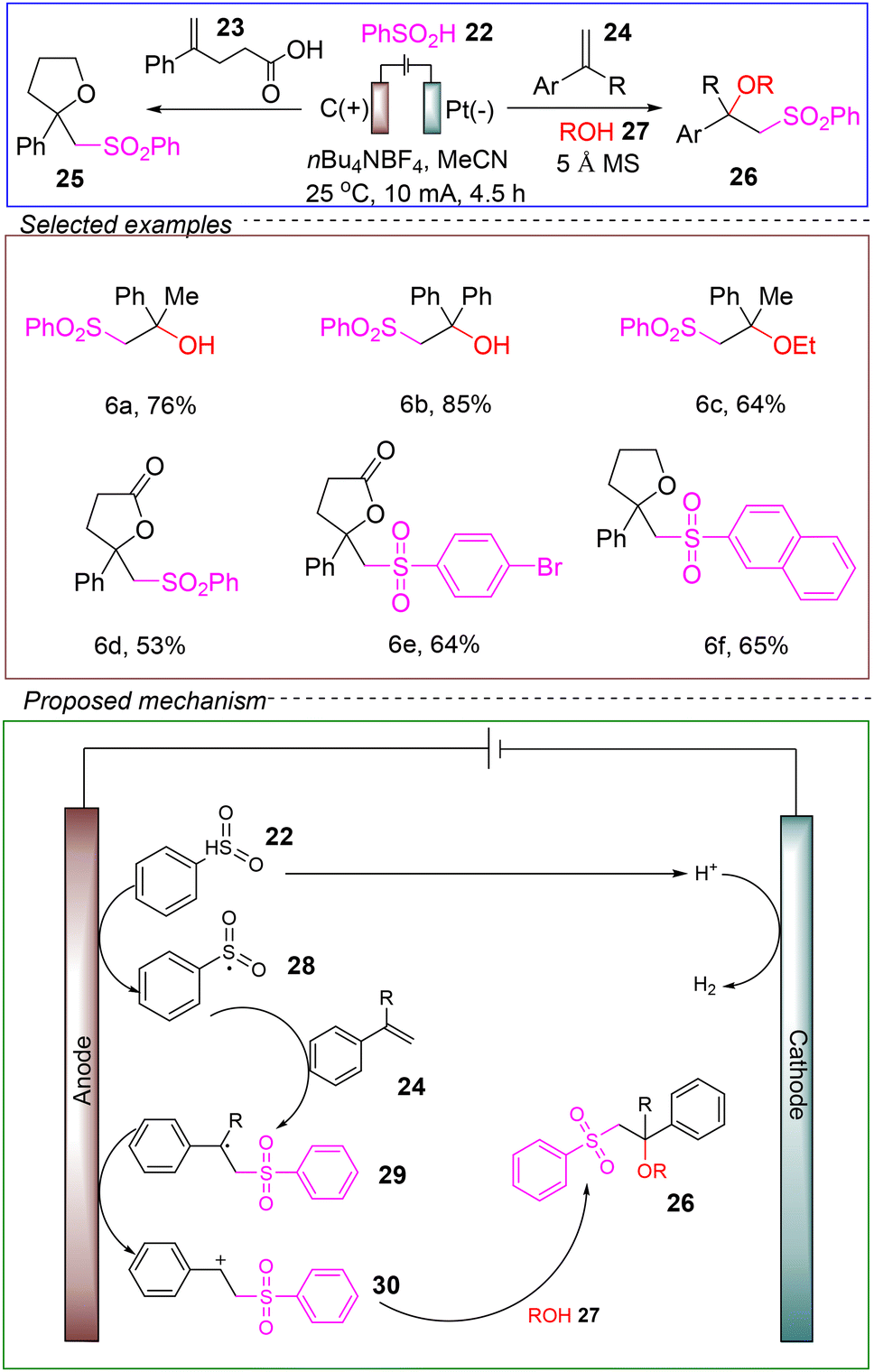 In 2019, Sun and co-workers also utilized sulfinate salts to achieve the electrochemical oxysulfonation of alkenes. They conducted the reaction in an undivided cell with a graphite rod anode and a platinum cathode, using alkene 24 and phenyl sulfinate 22 as model substrates. 5 Å MS served as the catalyst and n-Bu4NBF4 acted as the electrolyte. When a mixture of acetonitrile and water was used, the reaction successfully produced β-hydroxy sulfone after 4.5 hours at 25 °C and a constant current of 10 mA. By substituting water with alcohol 27, the corresponding β-alkoxy sulfone was obtained. This synthetic method is also applicable to 4-phenylpentenoic acid and various aromatic sulfinate substrates, yielding β-carbonyl oxysulfones (Scheme 6).59