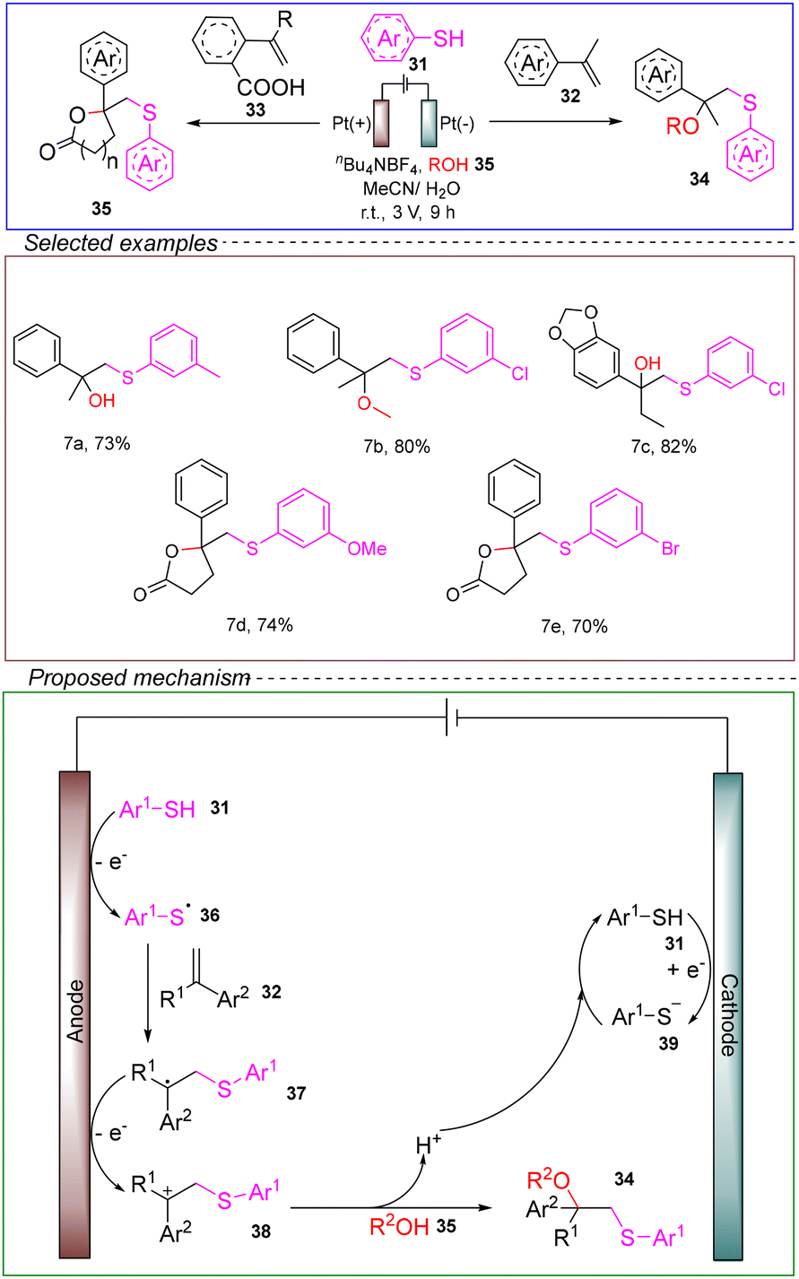 The Mei group achieved the electrochemical oxidative sulfuration of styrene using thiols and nucleophilic water/alcohols. The reaction took place in a non-divided cell with a carbon anode and a platinum cathode, using 1-alkene-2-phenyl 31 and 4-methoxyphenyl ethanol 32 as model substrates, alcohol 35 as the nucleophilic reagent, tetrabutylammonium tetrafluoroborate as the electrolyte, and acetonitrile as the solvent, the reaction was conducted at a constant voltage of 3 V for 9 hours at room temperature, resulting in the electrochemical oxidative sulfuration (Scheme 7).60