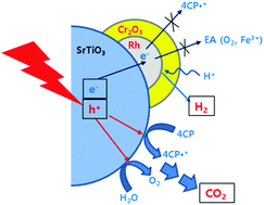 Dual-functional photocatalysis for H2 evolution with the simultaneous mineralization of 4-chlorophenol was achieved under de-aerated conditions using a Cr2O3/Rh/SrTiO3 photocatalyst which has Rh nanoparticles covered with a thin Cr2O3 barrier layer to selectively control and maximize the dual-functional photocatalytic activity.